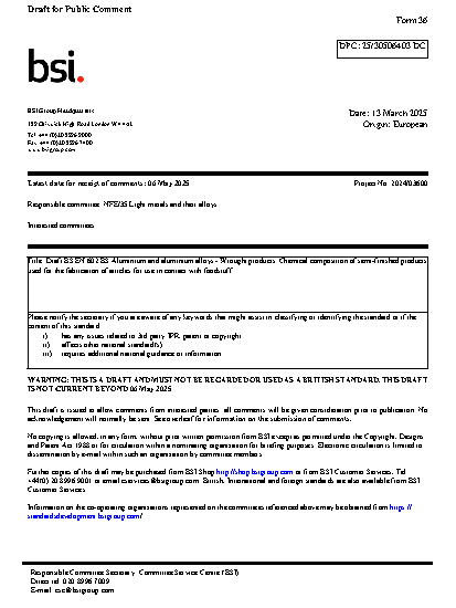 BS EN 602 Aluminium and aluminium alloys - Wrought products. Chemical composition of semi-finished products used for the fabrication of articles for use in contact with foodstuff