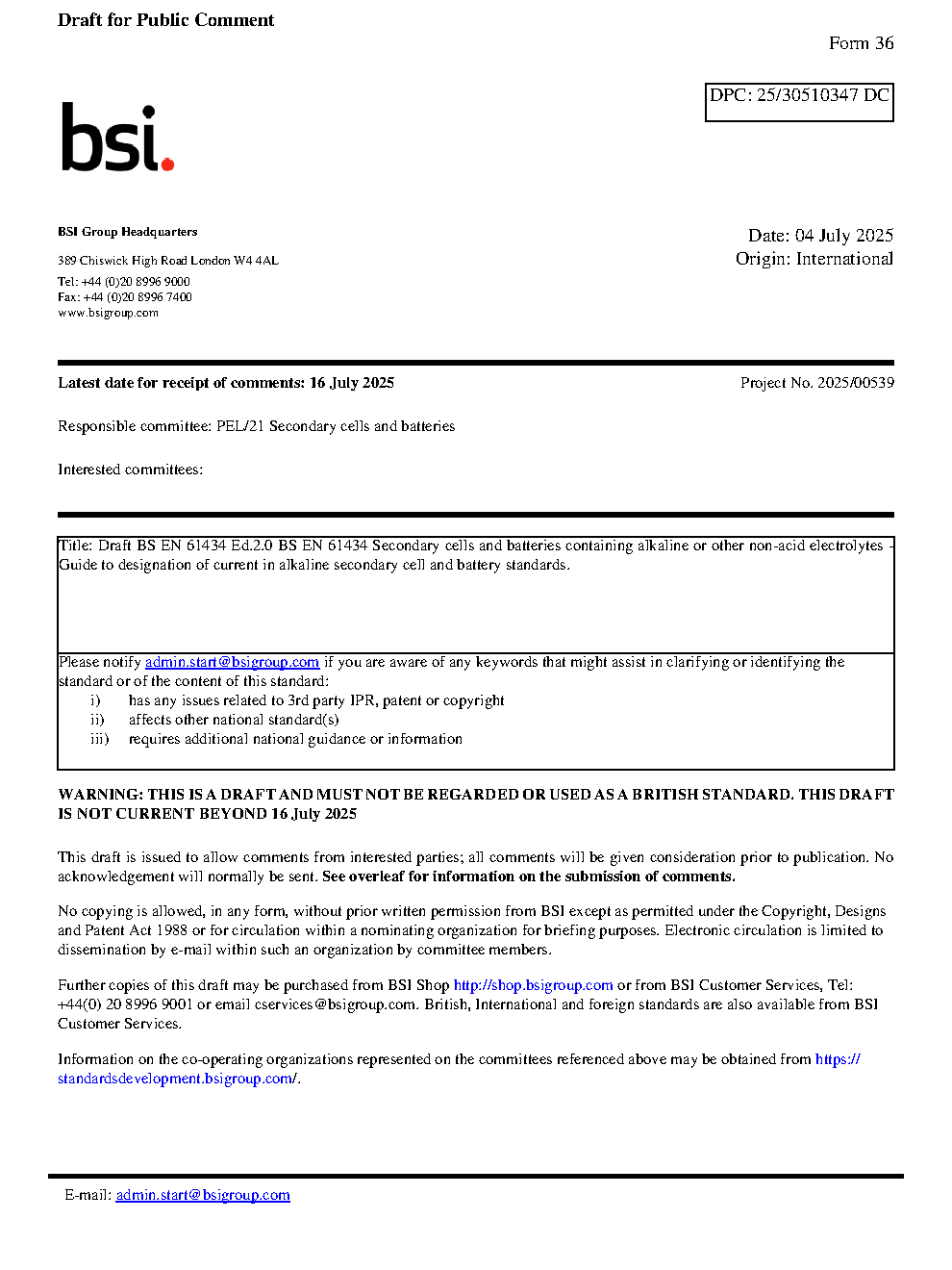 Draft BS EN 61434 Secondary cells and batteries containing alkaline or other non-acid electrolytes. Guide to designation of current in alkaline secondary cell and battery standards