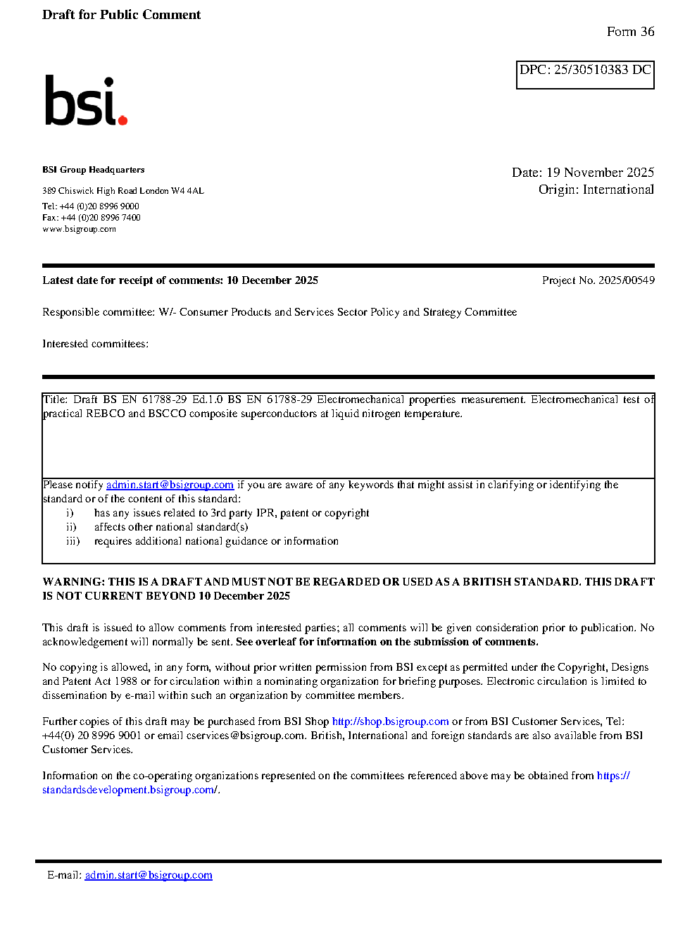 Draft BS EN 61788-29 Electromechanical properties measurement. Electromechanical test of practical REBCO and BSCCO composite superconductors at liquid nitrogen temperature