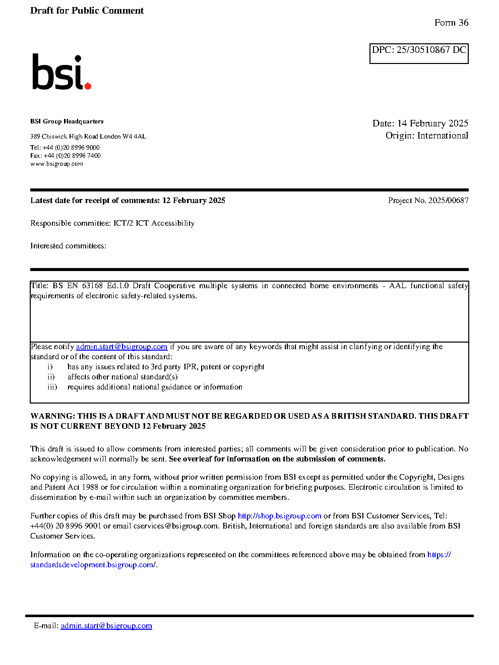 Draft BS EN 63168 Ed.1.0 Cooperative multiple systems in connected home environments - AAL functional safety requirements of electronic safety-related systems