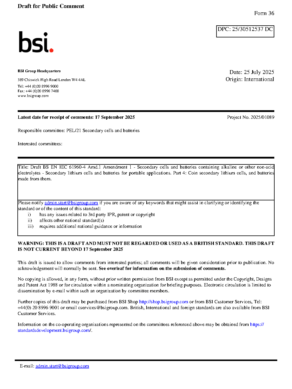 BS EN IEC 61960-4 Amd.1 Amendment 1 - Secondary cells and batteries containing alkaline or other non-acid electrolytes lithium for portable applications Part 4: Coin secondary cells, made from them