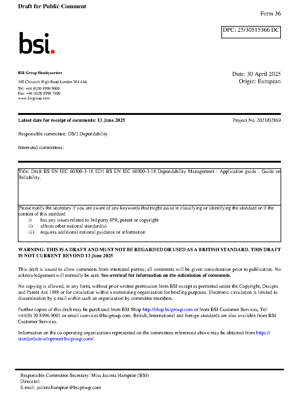 Draft BS EN IEC 60300-3-18 Dependability Management. Application guide. Guide on Reliability