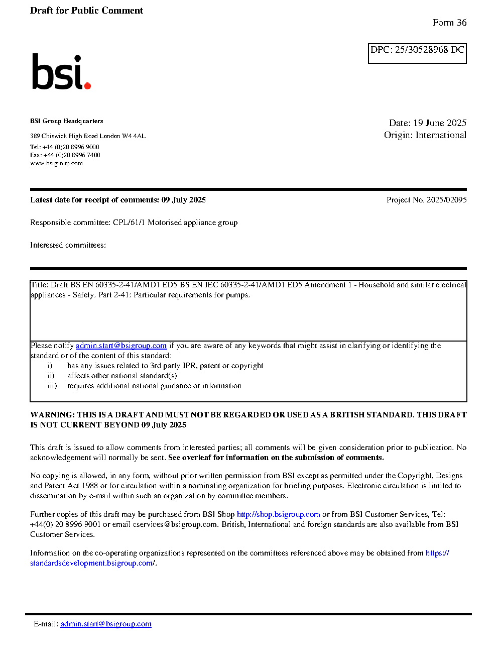 Draft BS EN IEC 60335-2-41/AMD1 ED5 Amendment 1. Household and similar electrical appliances. Safety Part 2-41. Particular requirements for pumps