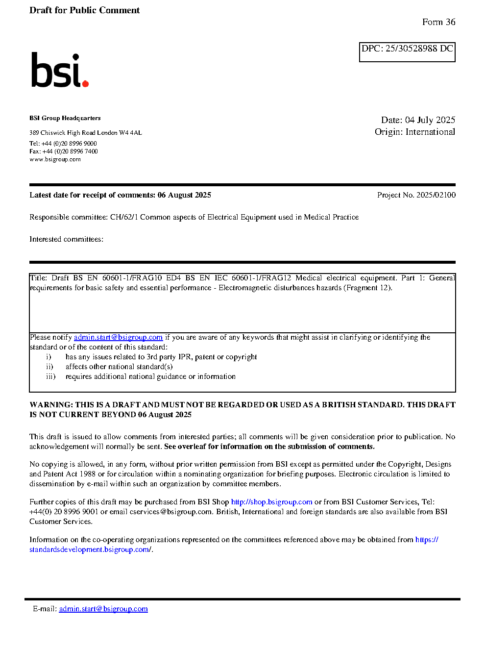 Draft BS EN IEC 60601-1/FRAG12. Medical electrical equipment Part 1. General requirements for basic safety and essential performance. Electromagnetic disturbances hazards (Fragment 12)