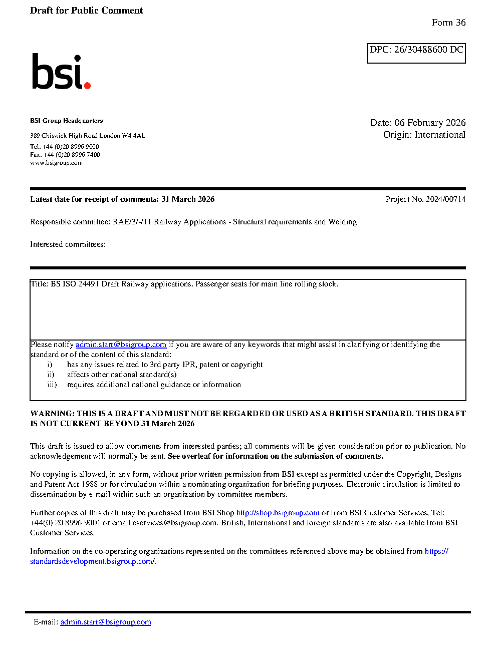 Draft BS ISO 24491 Railway applications. Passenger seats for main line rolling stock
