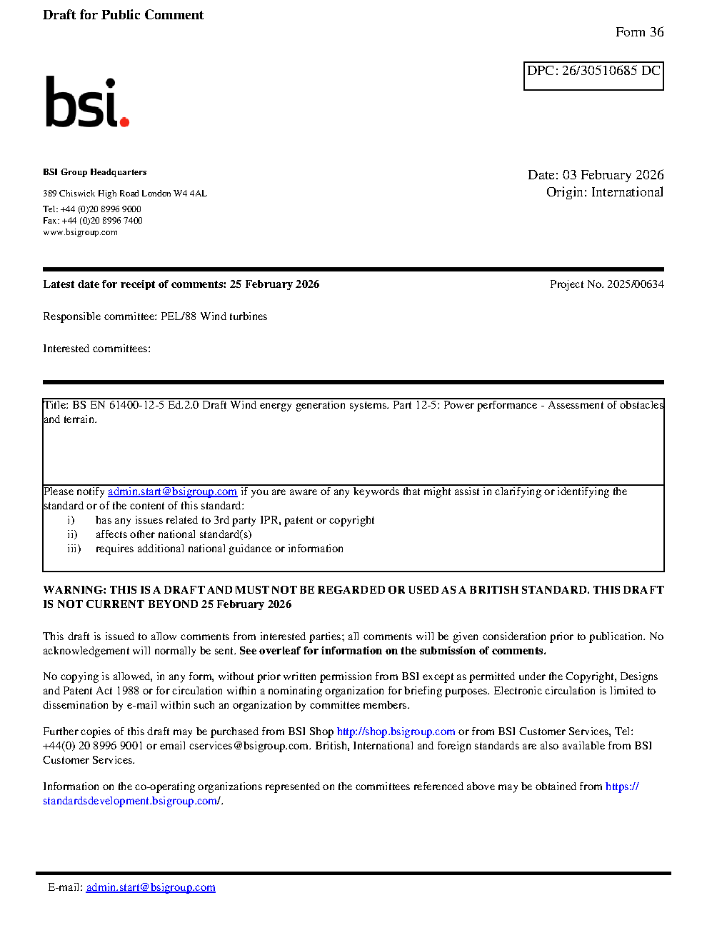 Draft BS EN 61400-12-5 Ed.2.0 Wind energy generation systems Part 12-5: Power performance - Assessment of obstacles and terrain
