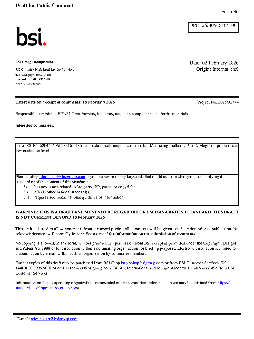 Draft BS EN 62044-2 Ed.2.0 Cores made of soft magnetic materials - Measuring methods Part 2: Magnetic properties at low excitation level