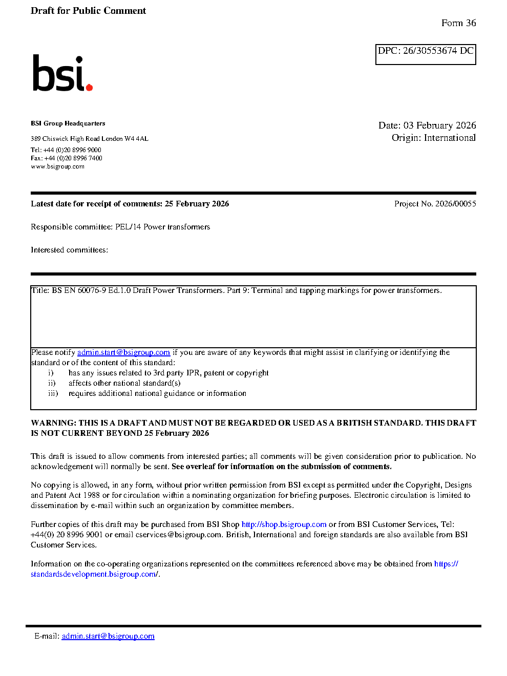 Draft BS EN 60076-9 Ed.1.0 Power Transformers Part 9: Terminal and tapping markings for power transformers