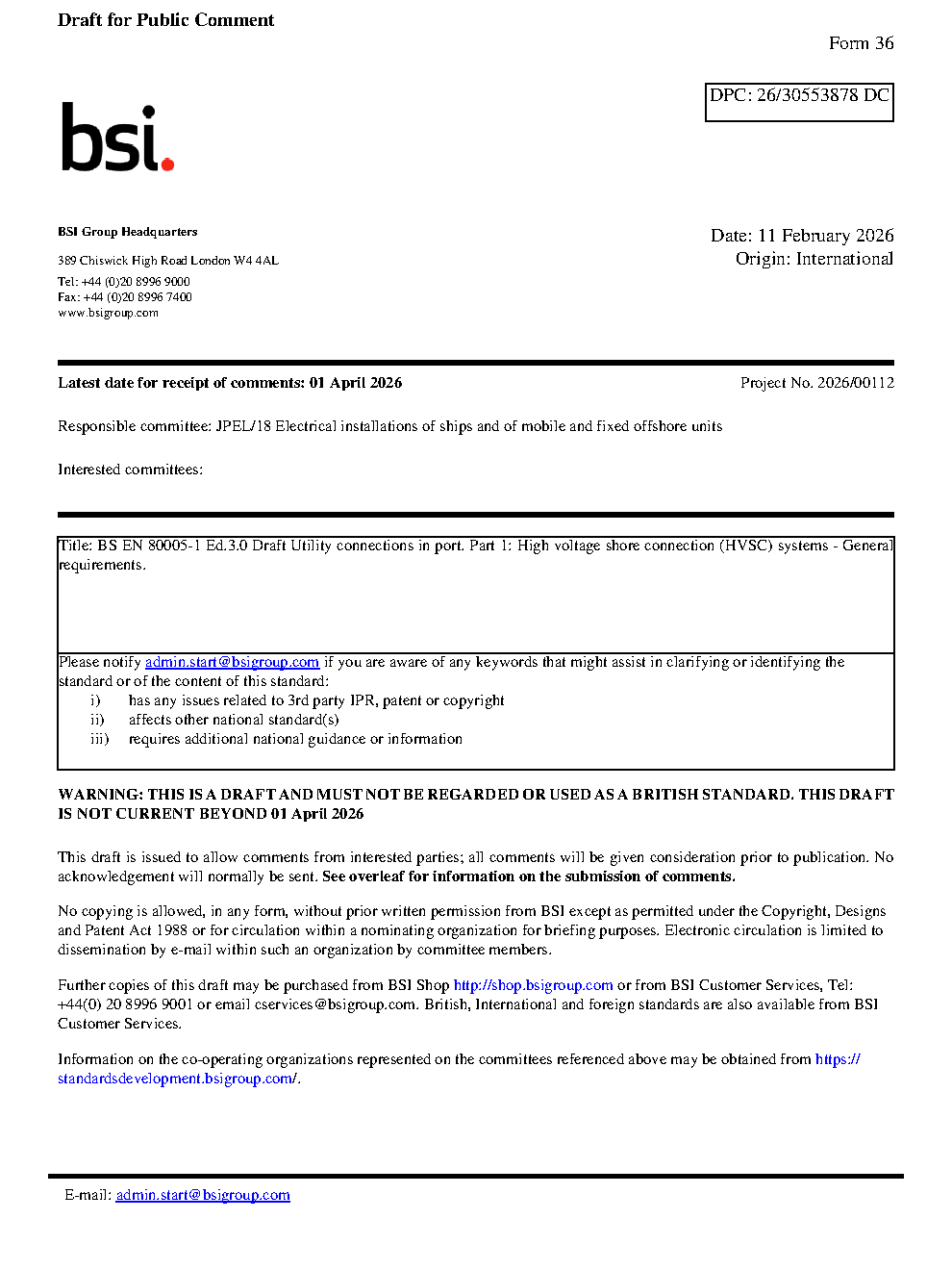 Draft BS EN 80005-1 Ed.3.0 Utility connections in port Part 1: High voltage shore connection (HVSC) systems - General requirements