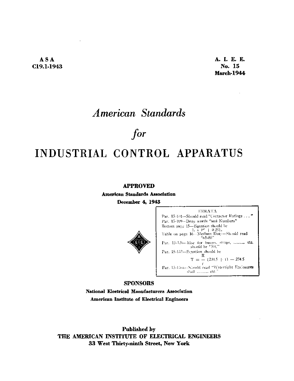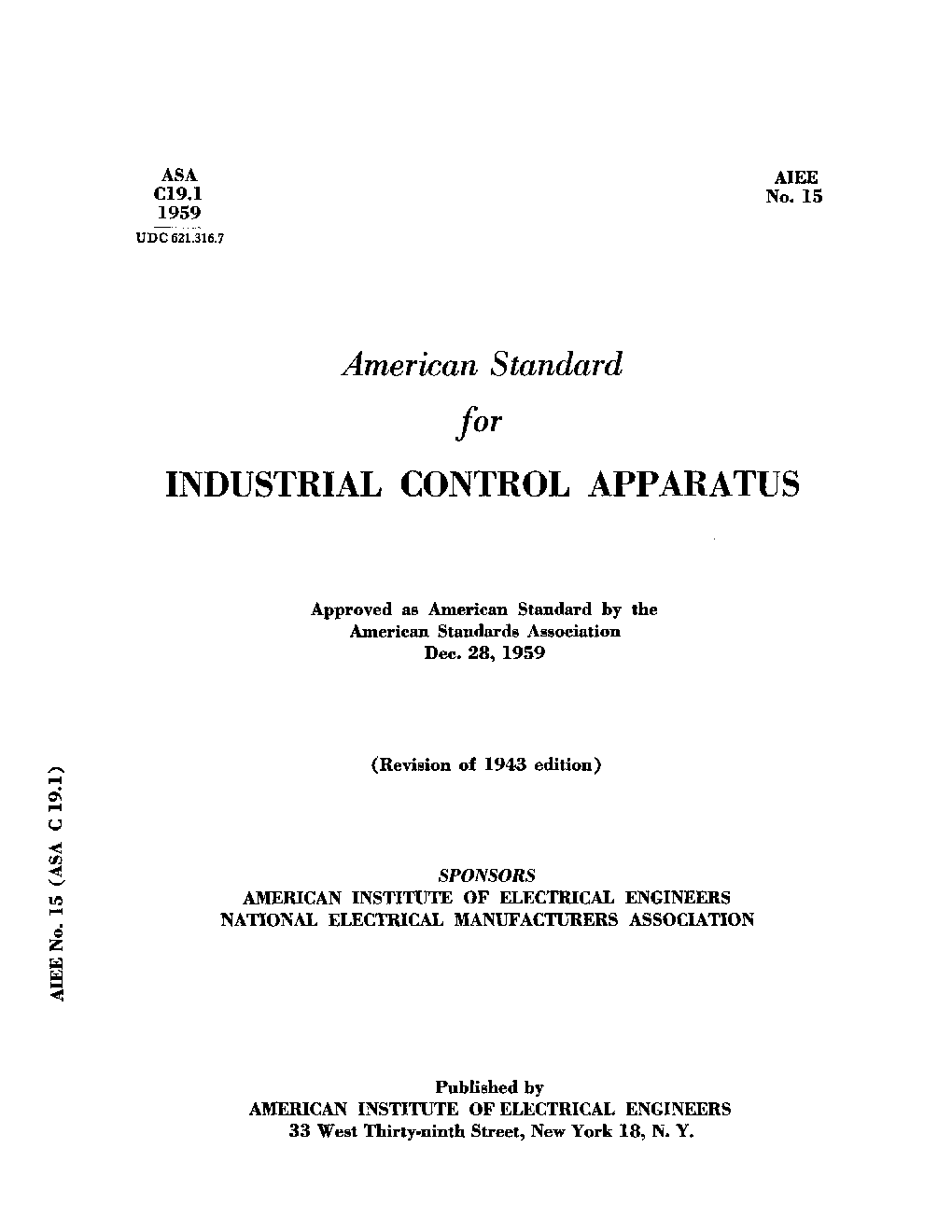 This Standard covers all of the following devices, whether electric, magnetic, mechanical or electronic, (except those intended specifically for marine auxiliaries and propulsion control apparatus, mine locomotive control apparatus and railway and railroad locomotion) which, individually or grouped, serve to govern in some predetermined manner the electric power delivered to the apparatus to which they are connected and intended to function on commercial voltages of 750 volts or less direct current and 500 volts or less alternating current.