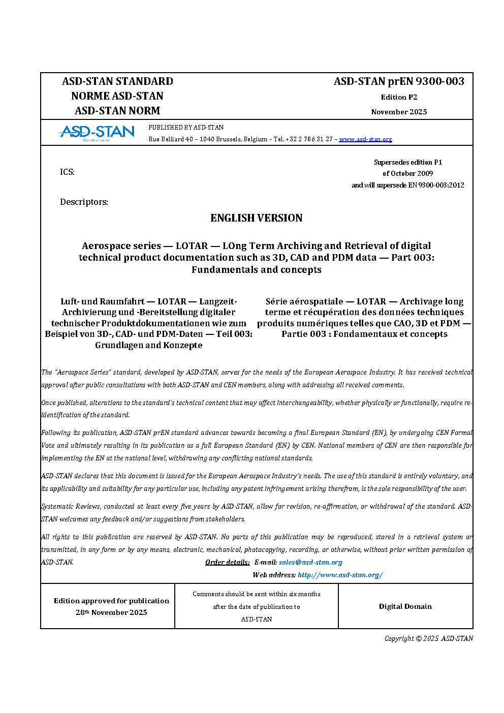 This document specifies the fundamentals and concepts for the long-term preservation of digital product and technical data. EN 9300 is a series of separate standard parts that elucidate various regulatory and business requirements, applicable domain specific methodologies and are extensible for future long-term archiving formats and data management practices.EN 9300-003 will focus on the fundamentals and concepts of long-term archival and retrieval of digital product and technical data.