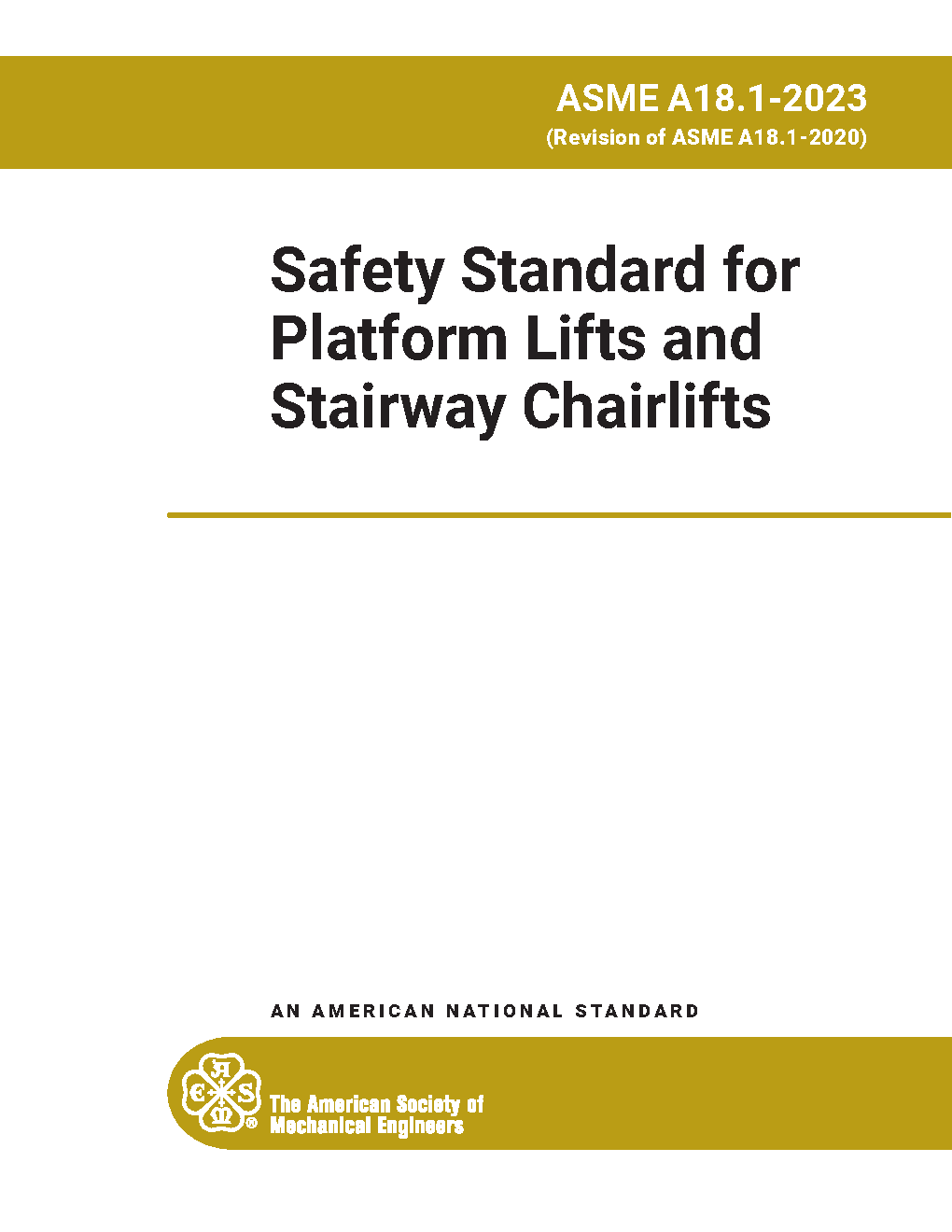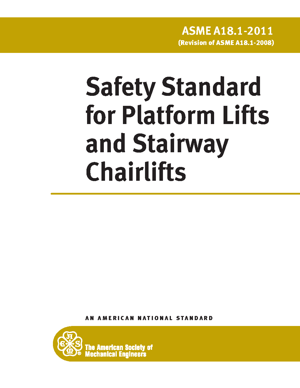 The ASME A18.1 Safety Standard for Platform Lifts and Stairway Chairlifts presents certain guides for the design, construction, installation, operation, inspection, testing, maintenance, and repair of inclined stairway chairlifts, and inclined and vertical platform lifts. It covers devices intended for transportation of a mobility-impaired person only - typically within household applications. The ultimate goal of this Standard is to help protect public safety, while reflecting best-practices of industry.