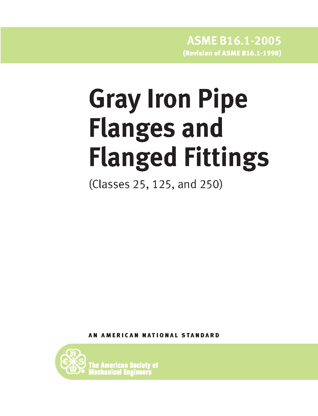 This Standard for Classes 25, 125, and 250 Cast Iron Pipe Flanges and Flanged Fittings. It includes (a) pressure-temperature ratings, (b) sizes and method of designating openings of reducing fittings, (c) marking, (d) materials, (e) dimensions and tolerances, (f) bolting and gaskets (g) pressure testing.