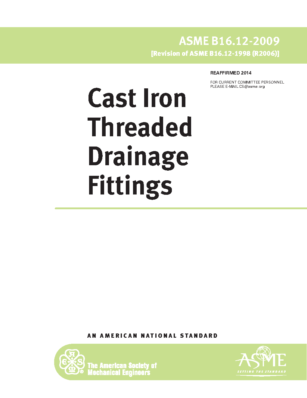This Standard for cast iron threaded drainage fittings covers: (a) sizes and method of designating openings in reducing fittings (b) marking (c) material (d) dimensions and tolerances (e) threading (f) ribs (g) coatings (h) face bevel. This Standard covers fittings intended for use in gravity drainage systems subject only to the gravity head of waste liquids at temperatures from ambient to approximately 100C (212F). The use of this Standard for pressurized waste handling systems is the responsibility of the user and is subject to the requirements of any applicable code.