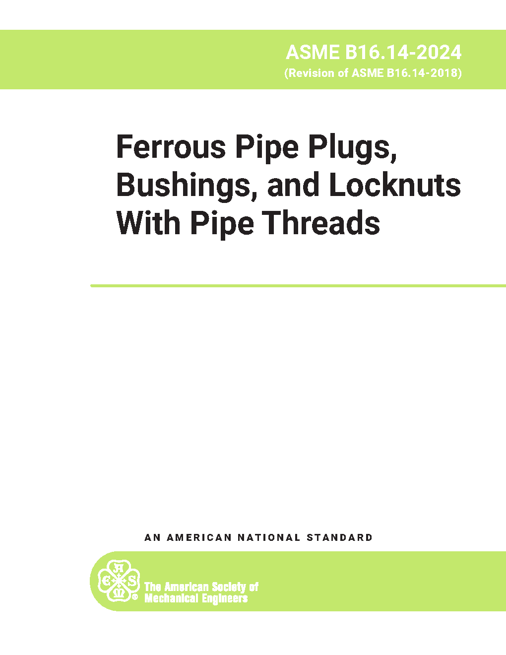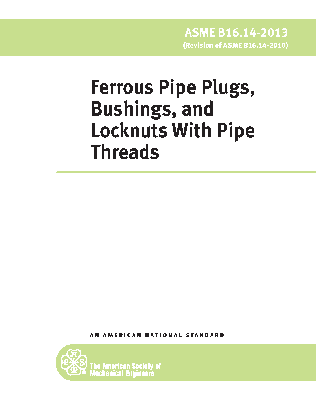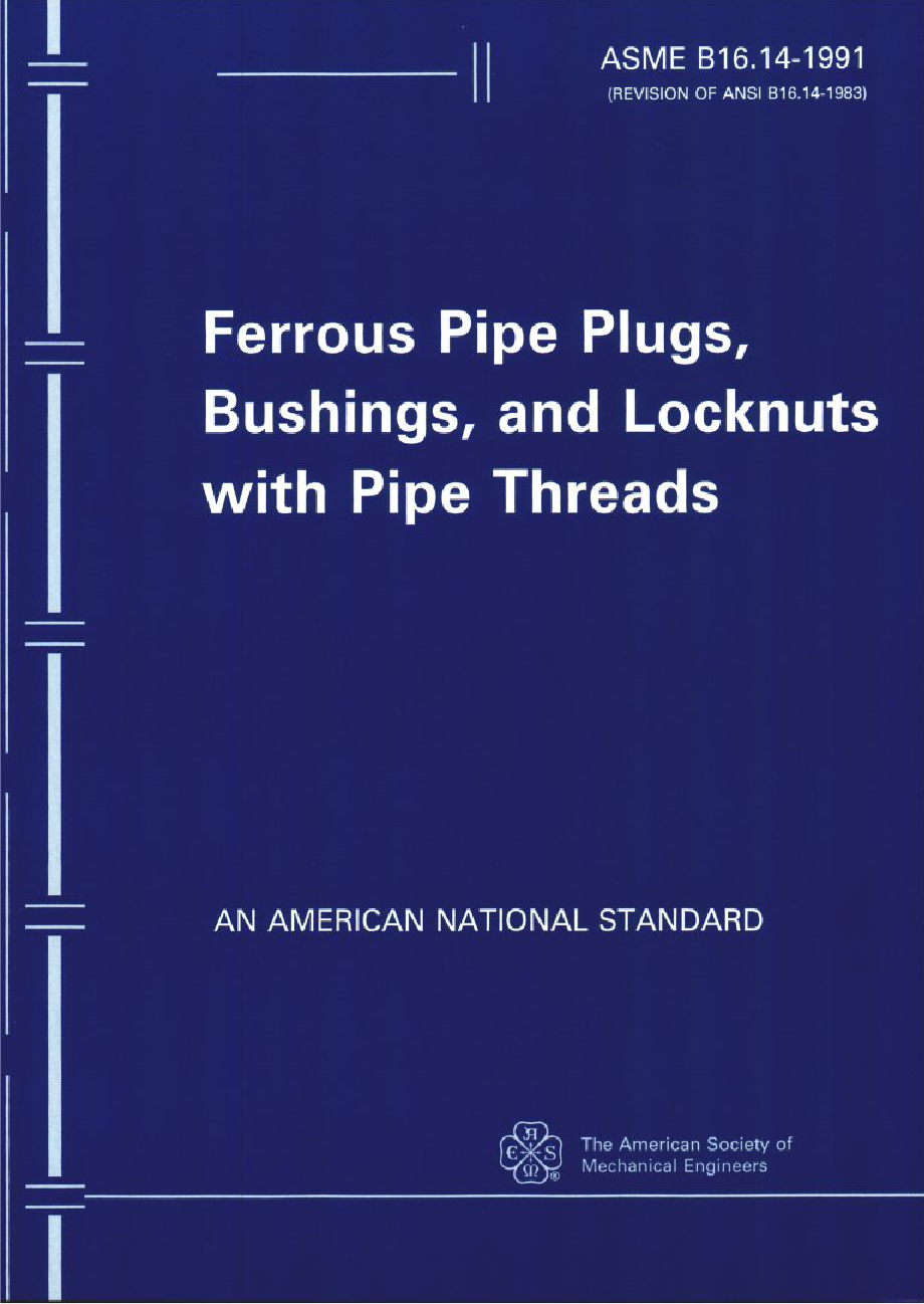 This Standard for Ferrous Pipe Plugs, Bushings, and Locknuts with Pipe Threads covers: (a) pressure-temperature ratings; (b) size; (c) marking; (d) materials; (e) dimensions and tolerances; (f) threading; and (g) pattern taper.