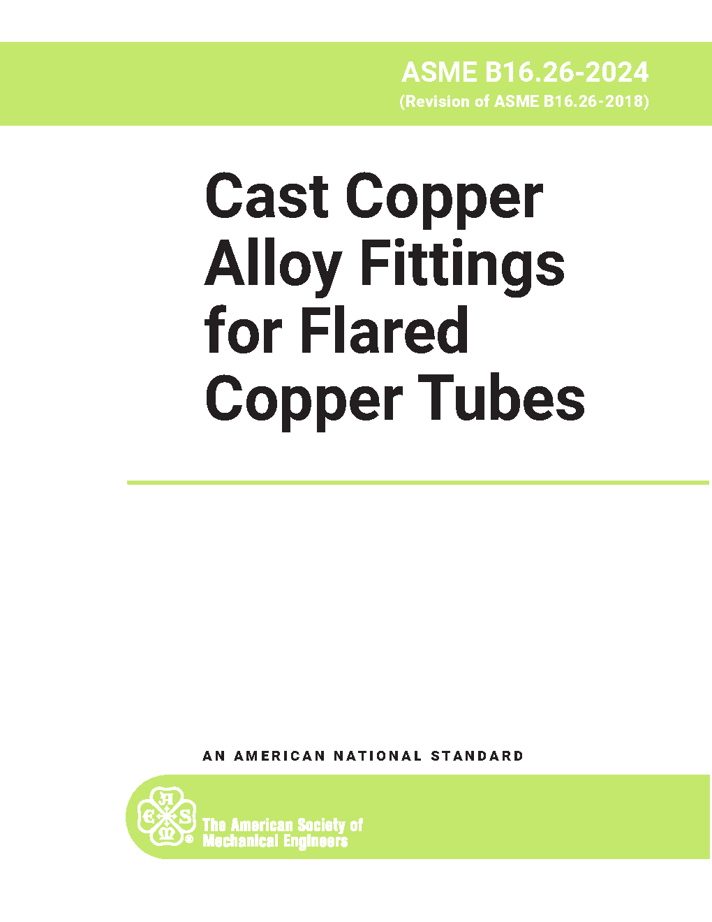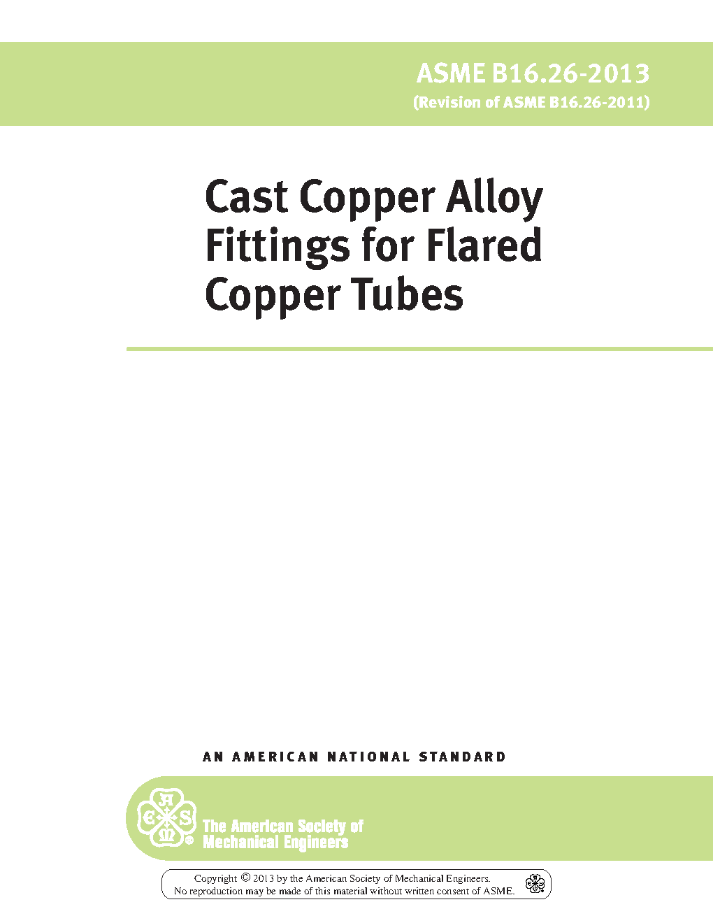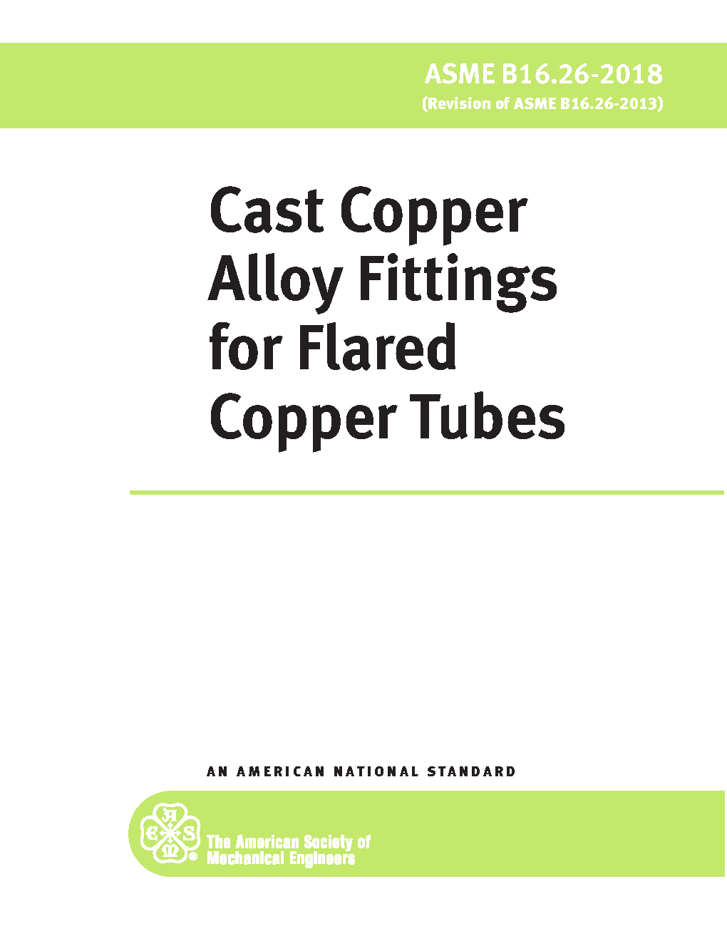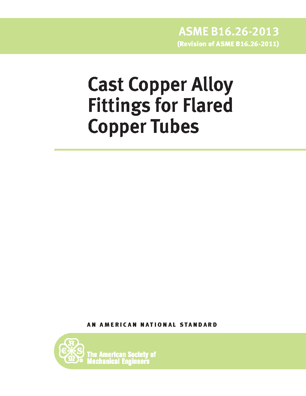 This Standard establishes specifications for cast copper alloy fittings and nuts used with flared seamless copper tube conforming to ASTM B 88 (water and general plumbing systems), including requirements for: (a) pressure rating;(b) size; (c) marking; (d) material; (e) dimensions; (f) threading and (g) hydrostatic testing.