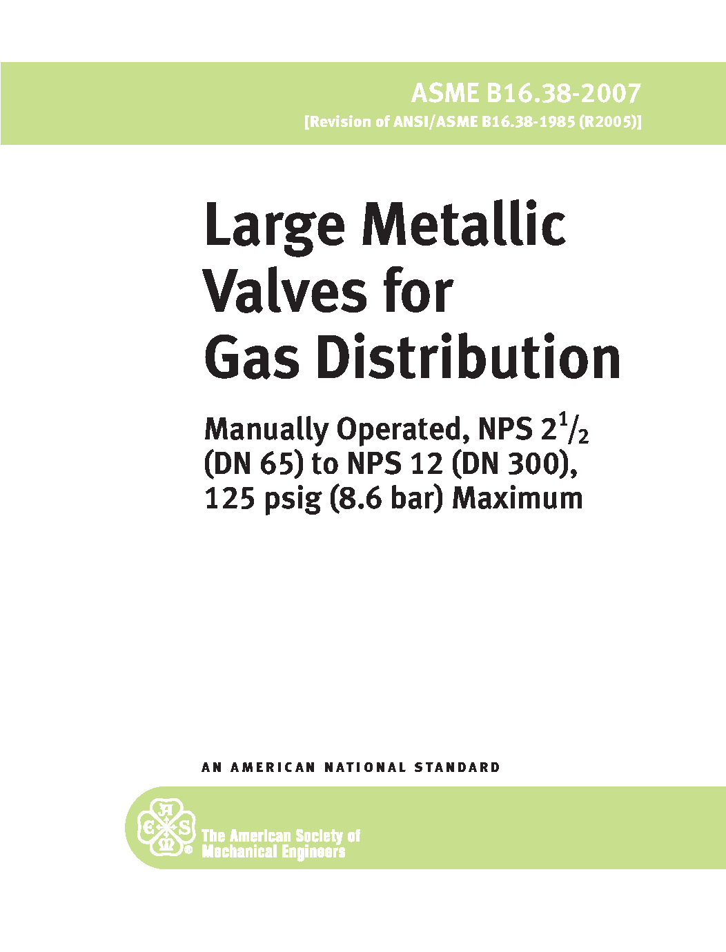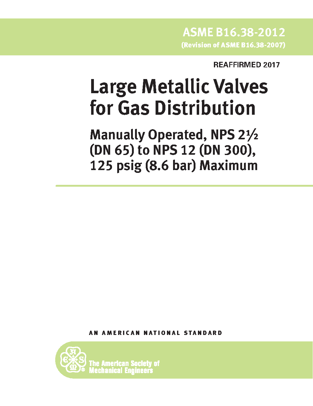There is a newer edition of this document available. This Standard covers requirements for manually operated metallic valves in nominal sizes 2 1/2 (DN 65) through 12 (DN 300) having the inlet and outlet on a common centerline. These valves are intended for controlling the flow of gas from open to fully closed positions, for use in distribution and service lines where the maximum gage pressure does not exceed 125 psig (8.6 bar). Valve seats, seals, and stem packing may be nonmetallic. This Standard sets forth the minimum capabilities, characteristics, and properties that a newly manufactured metallic valve must possess in order to be considered suitable for use in the piping systems indicated above, carrying natural gas, manufactured gas [includes synthetic natural gas (SNG)], and liquefied petroleum gases (distributed as a vapor, with or without the admixture of air) or mixtures thereof.