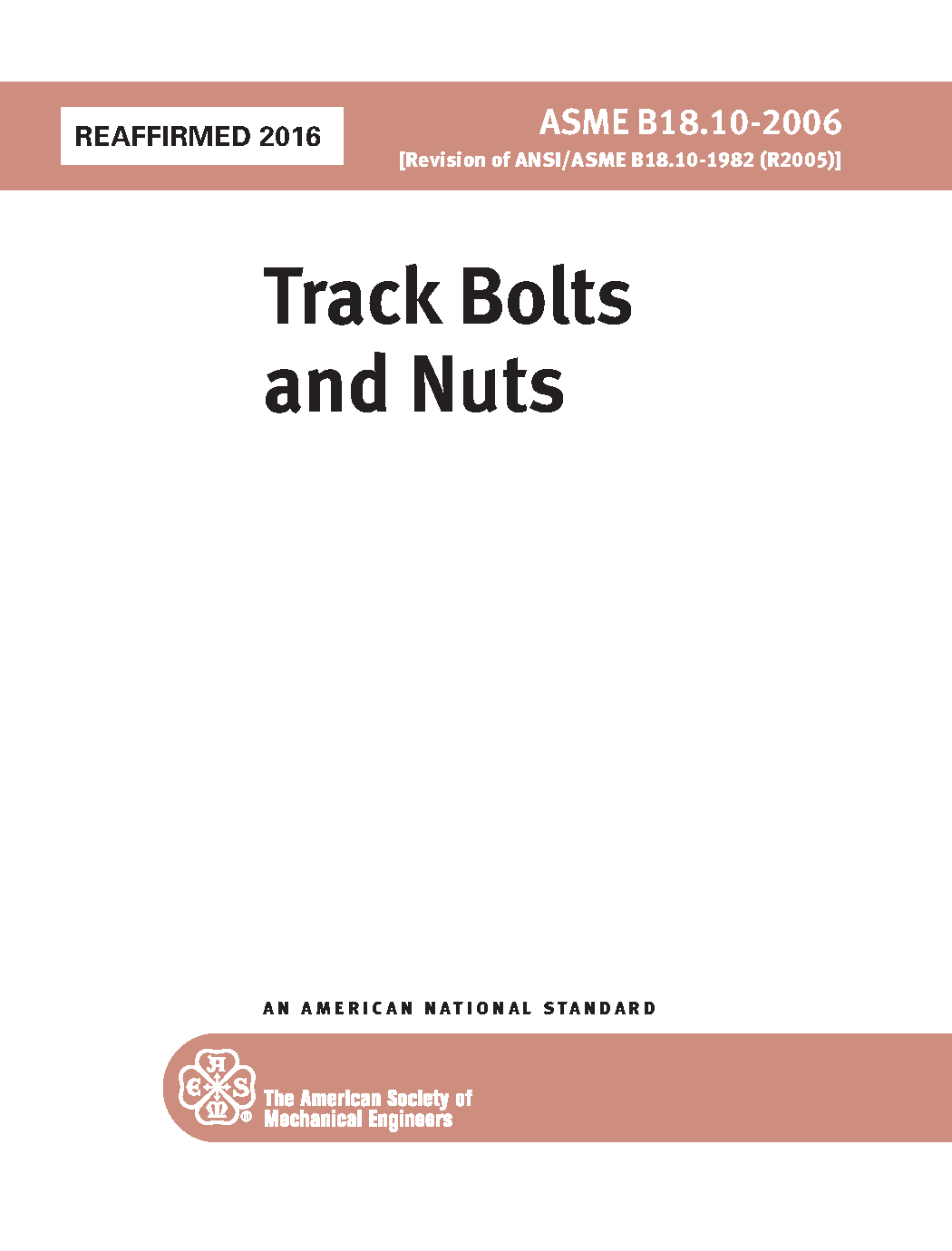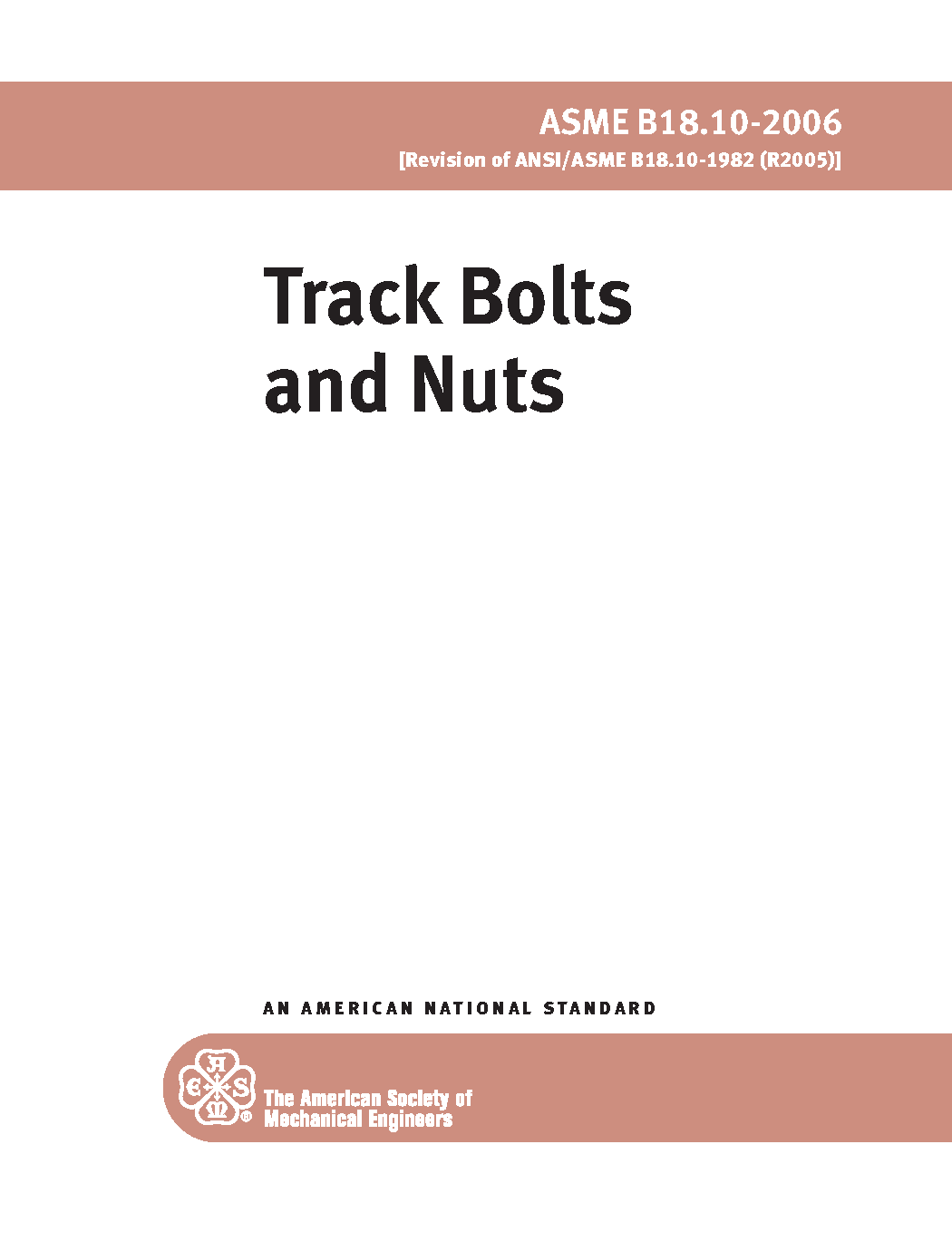 This Standard covers the complete general and dimensional data for inch series oval neck and elliptic neck track bolts and square nuts intended for use with these bolts, and recognized as an American National Standard. Sizes in use, but not recommended for new design, are included in the appendices of this Standard.