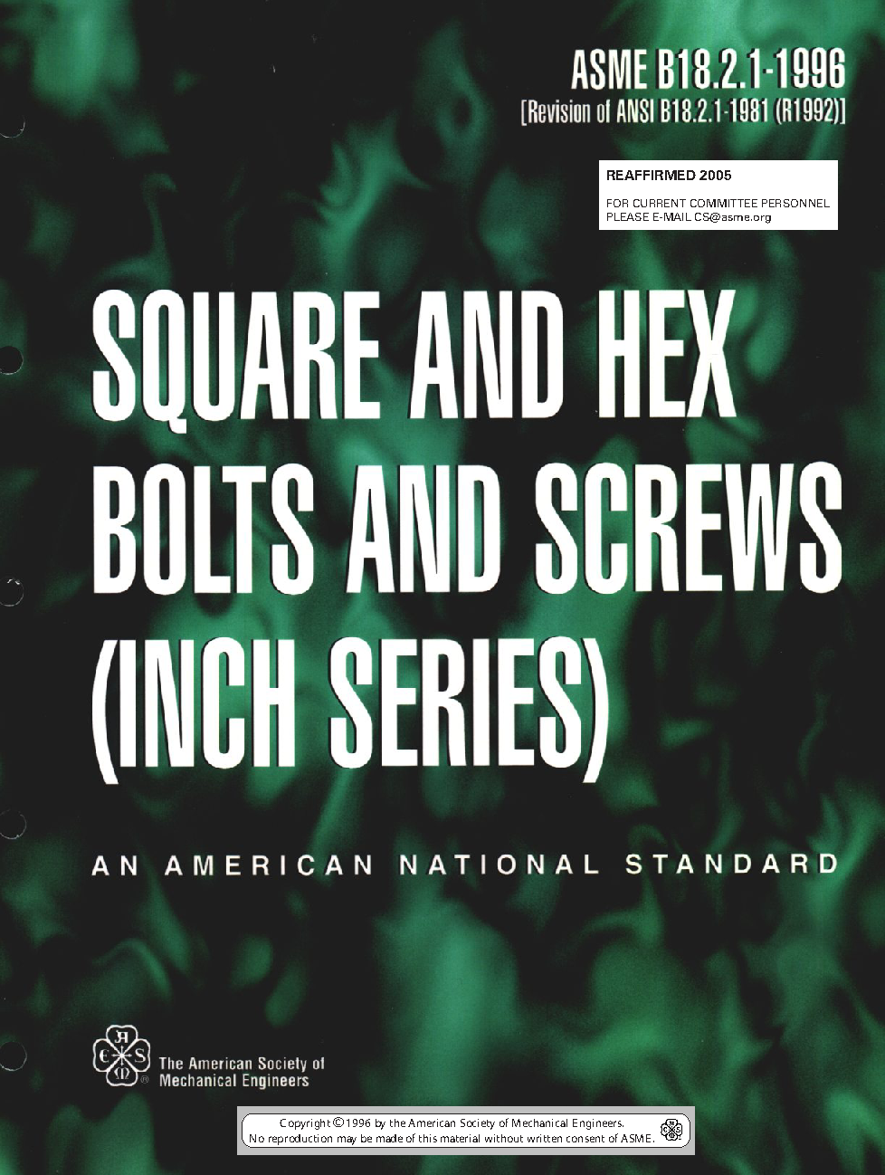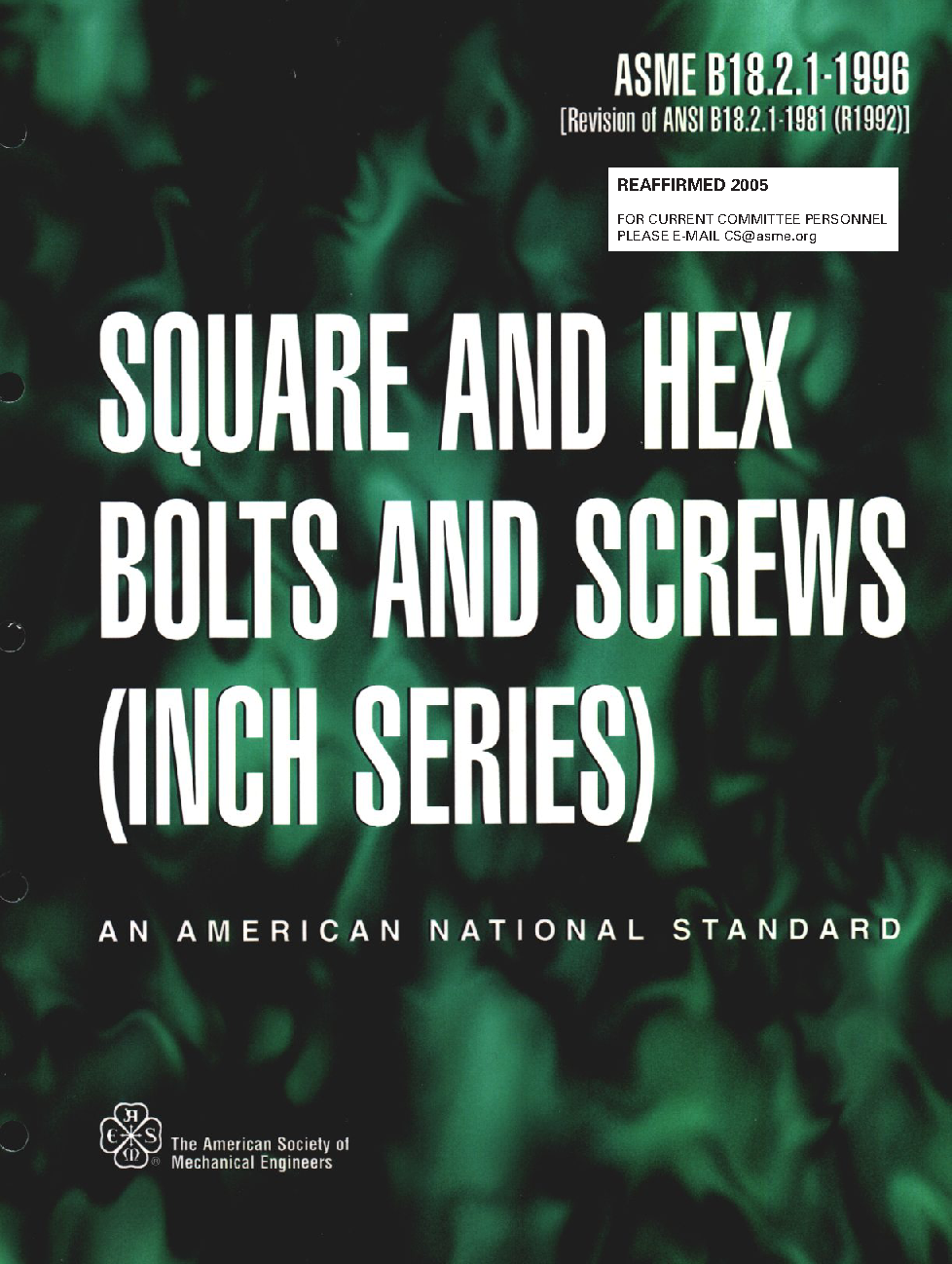 This Standard covers the complete general and dimensional data for nine product types of inch series square and hex bolts and screws. Hex flange head and lobed head designs are new in this revision, as are screw sizes 1 5/8, 1 7/8, and 3 1/8 through 6 inches. Appendices covering gages and gaging information plus formulas on which dimensional data are based are included. Heavy hex structural bolts, formerly covered in ANSI B18.2.1, are now covered in ASME B18.2.6.