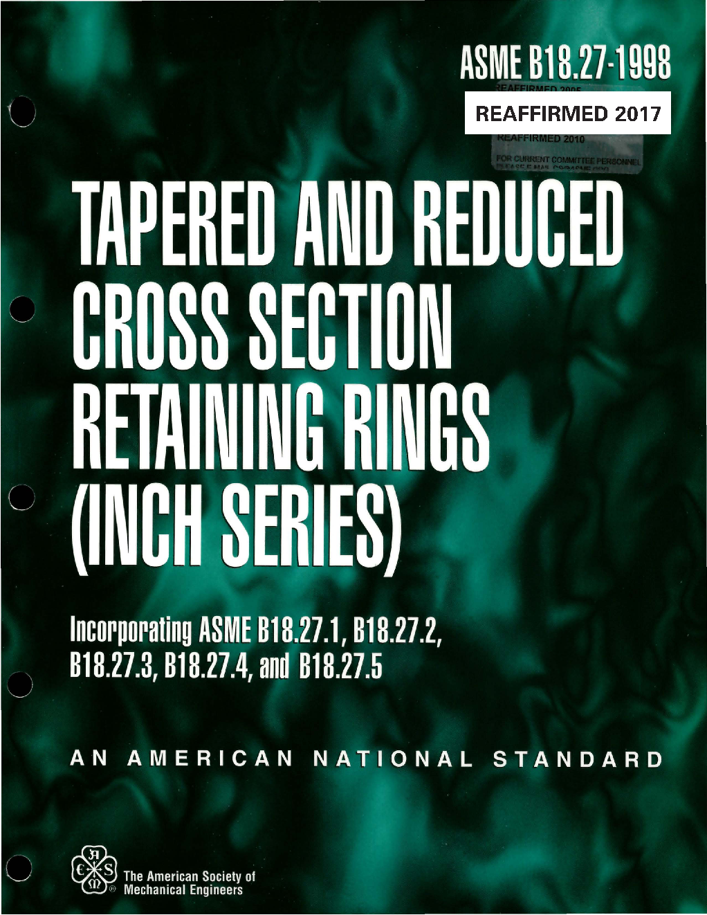 B18.27-1998 is a consolidation and update of B18.27.1, Part 1 External Type - NA1; Internal Type NA2; E-Ring Type - NA3; B18.27.2, Part 2 Heavy Duty External - NA4; Reinforced “E” Rings - NA5; “C” Type Rings - NA6; B18.27.3, Part 3 Bowed External - NA7; Bowed Internal - NA8; Bowed External “E” - NA9;