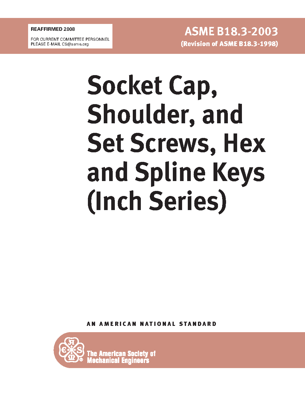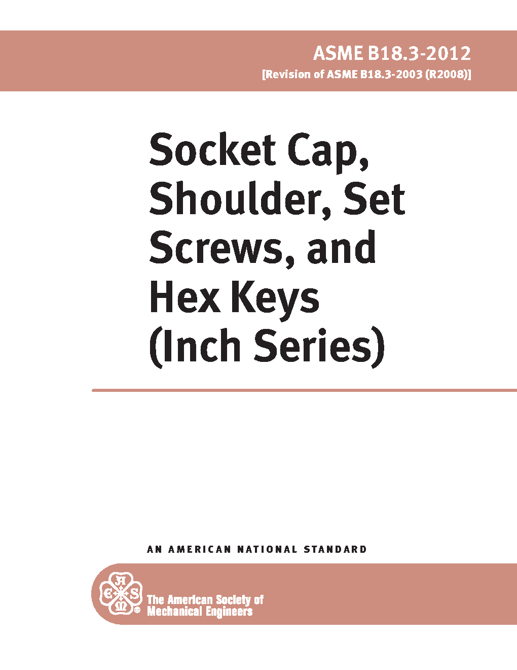 This Standard covers complete general and dimensional data for various types of hexagon socket cap screws, shoulder screws, set screws, and hexagon keys. Also included are appendices that provide specifications for hexagon socket gages and gaging, tables showing applicability of keys and bits to various socket screw types and sizes, drill and counterbore sizes for socket head cap screws, and formulas used for dimensional data. However, where questions arise concerning acceptance of product, the dimensions in the tables shall govern over recalculation by formula. The inclusion of dimensional data in this Standard is not intended to imply that all of the products described are stock production sizes. Consumers should consult with manufacturers concerning lists of stock production sizes.