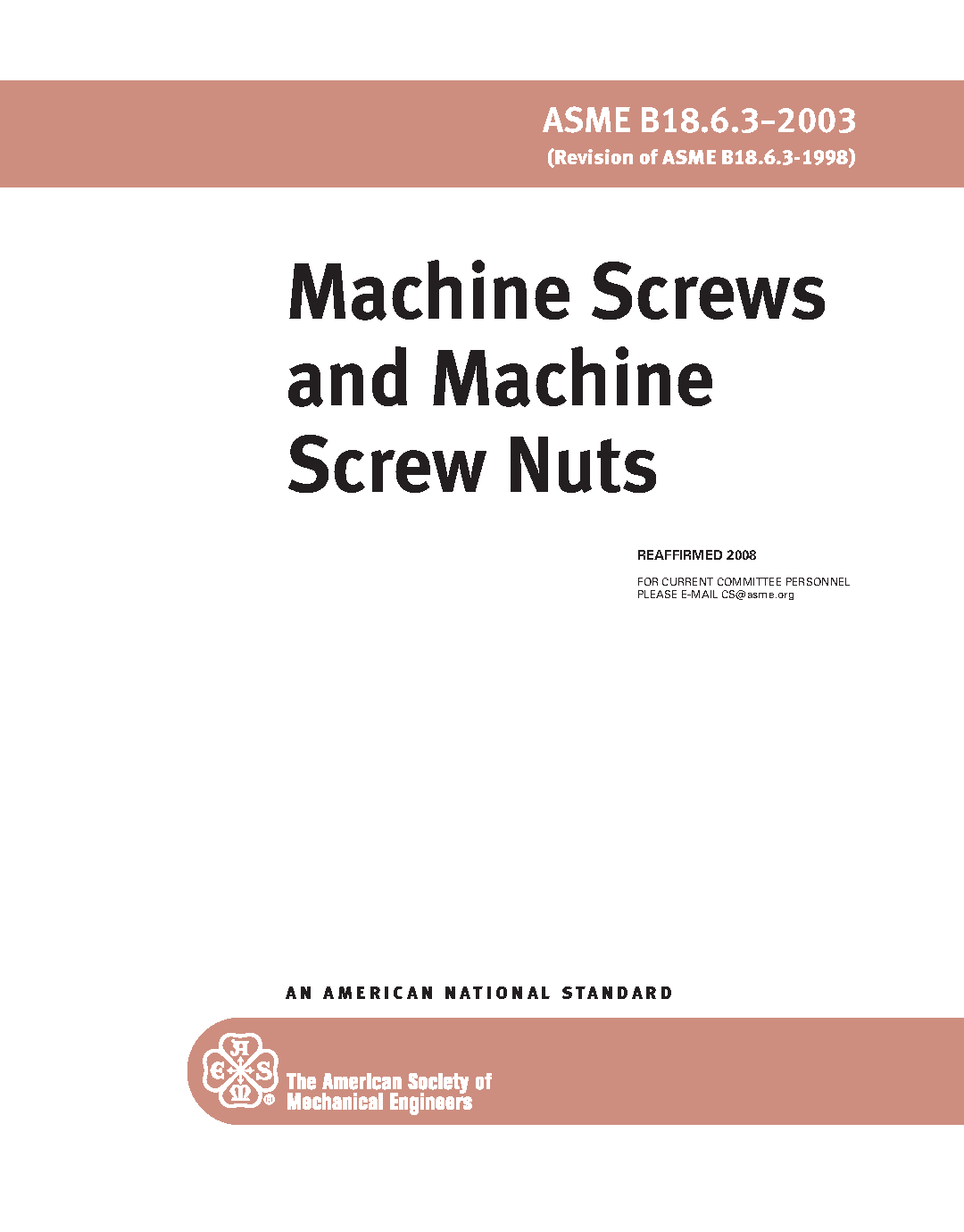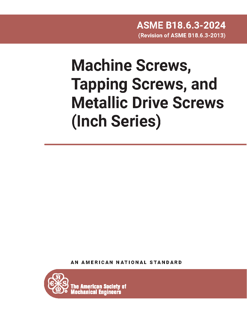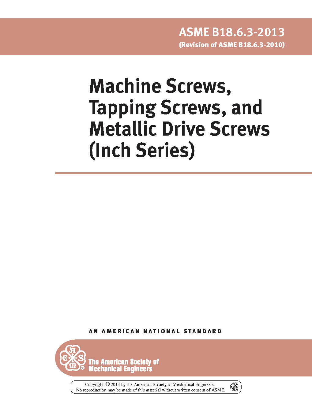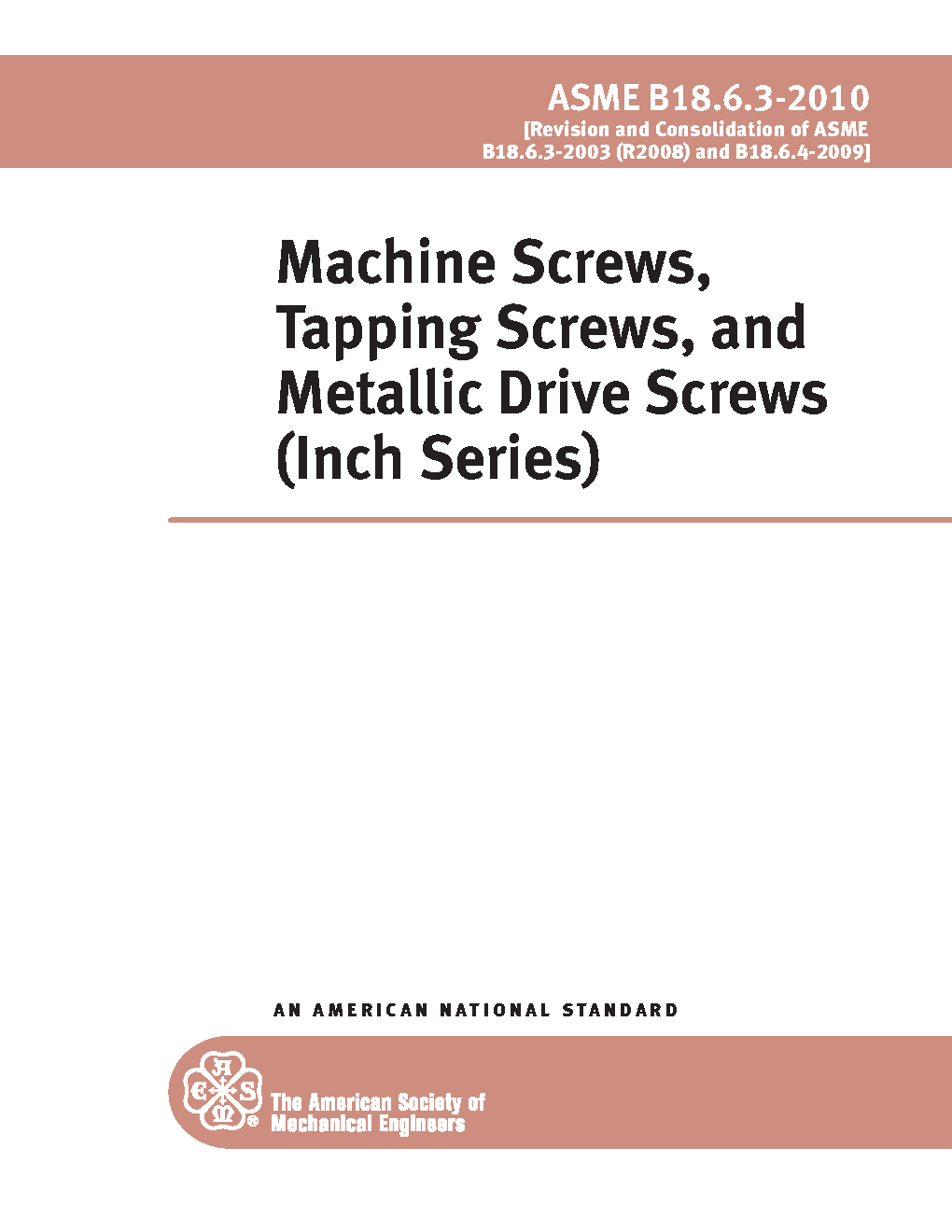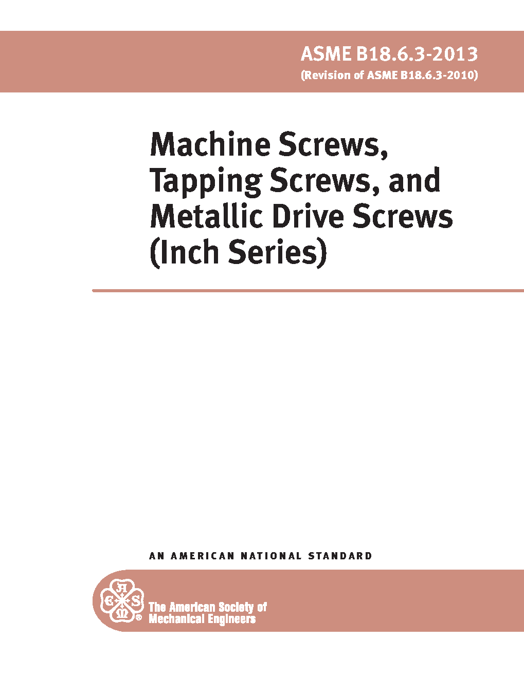This Standard is intended to cover the complete general and dimensional data for the various types of slotted and recessed head machine screws, tapping screws, and metallic drive screws recognized as American National Standard. Also included are appendices that provide specifications and instructions for the protrusion gaging of flat countersunk head screws; across-corners gaging of hex head screws; penetration gaging and wobble gaging of recessed head screws; approximate hole size for tapping screws; wrench openings for hex and square products; thread dimensions for the No. 0000, No. 000, and No. 00 sizes; means for determining effective grip lengths on screws; documentation for screw types and head types relegated to not-recommended or limited usage status; and formulas on which dimensional data are based. It shall be understood, however, that where questions arise concerning acceptance of product, the dimensions in the tables shall govern over recalculation by formula.