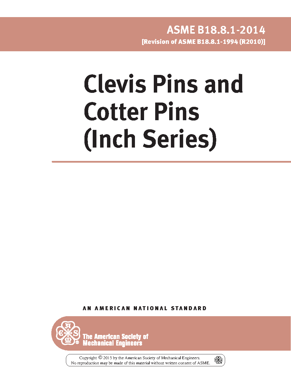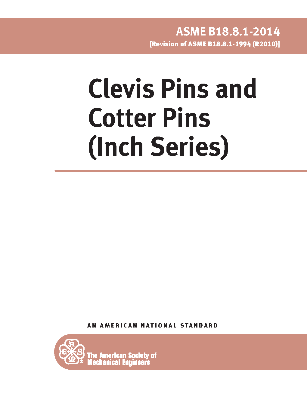 This Standard covers the complete dimensional and general data for clevis pins sizes 3/16 through 2 inch and cotter (split) pins sizes 1/32 through 3/4 inch of various materials. The inclusion of dimensional data in this Standard is not intended to imply that all products described are stock production items. Consumers should consult with suppliers concerning the availability of products.