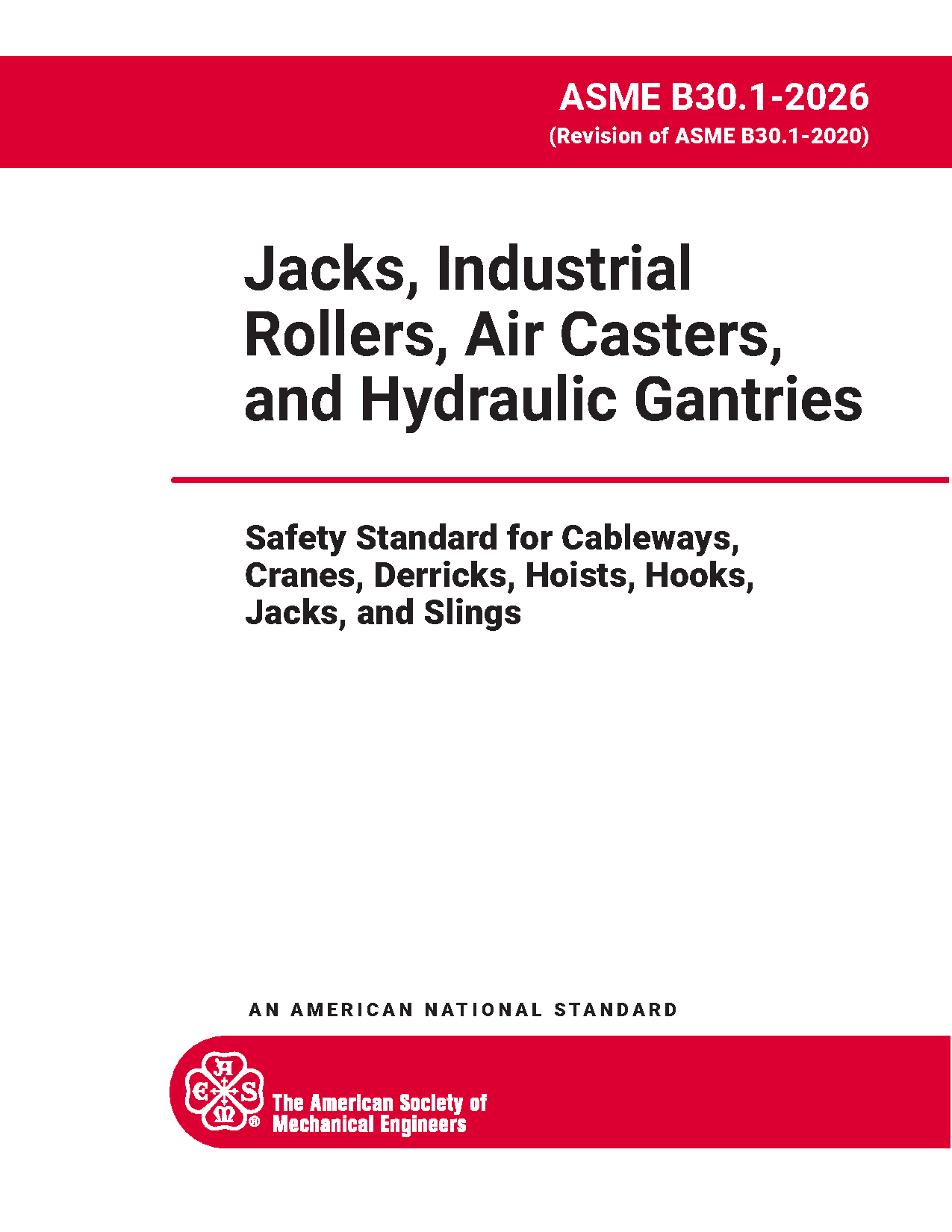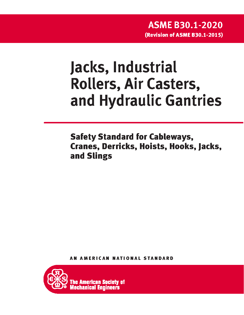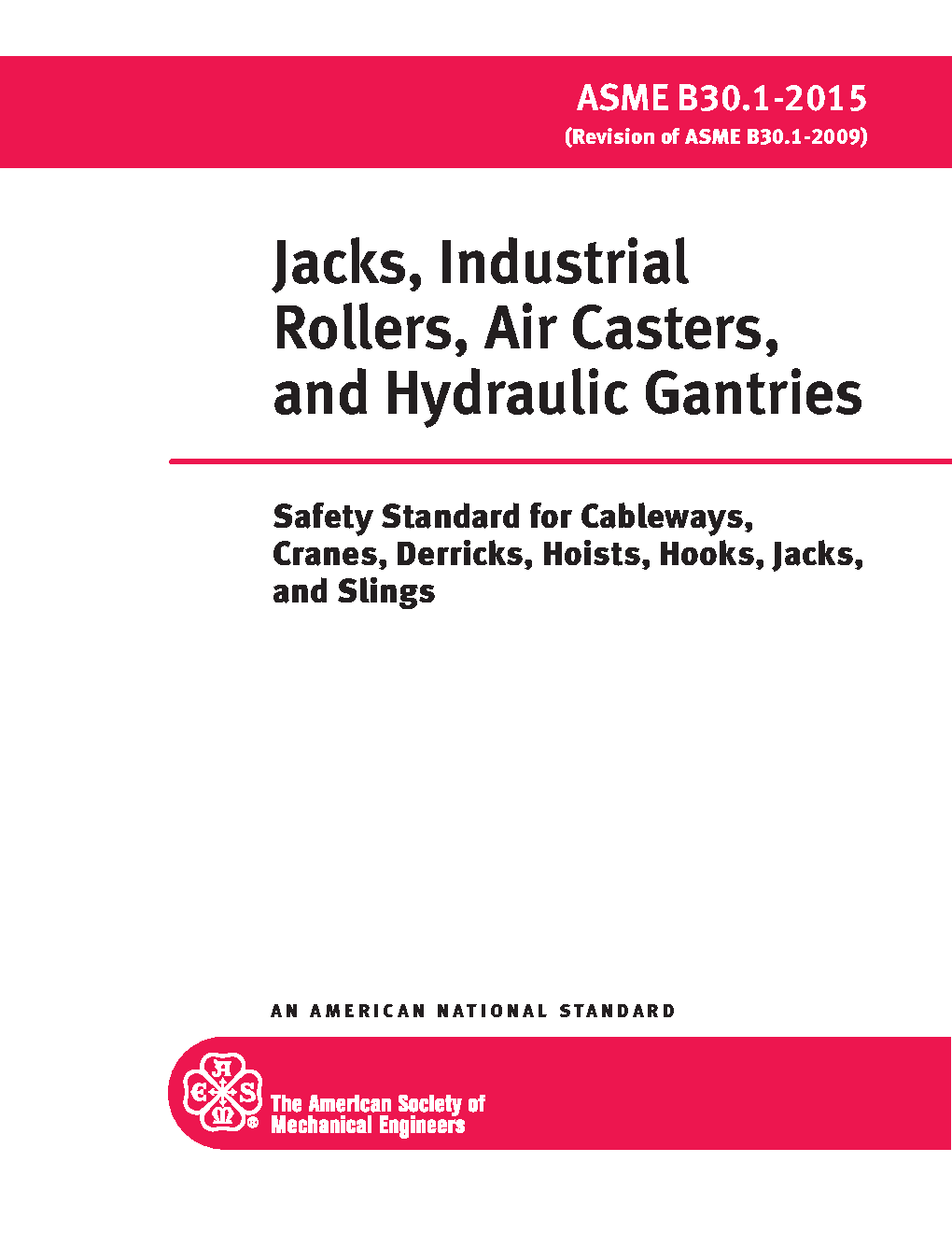 Volume B30.1 includes provisions that apply to the construction, operation, inspection, testing, and maintenance of mechanical ratchet jacks, hand- or power-operated mechanical screw jacks, hand- or power-operated hydraulic jacks, air lifting bags, industrial rollers, air casters, and telescopic hydraulic gantry systems. Not included in this Volume are jacks designed for automotive service, trip-lowered jacks, jacks designed for static support rather than lifting, and jacks, industrial rollers, air lifting bags or air casters that are an integral part of other equipment.
