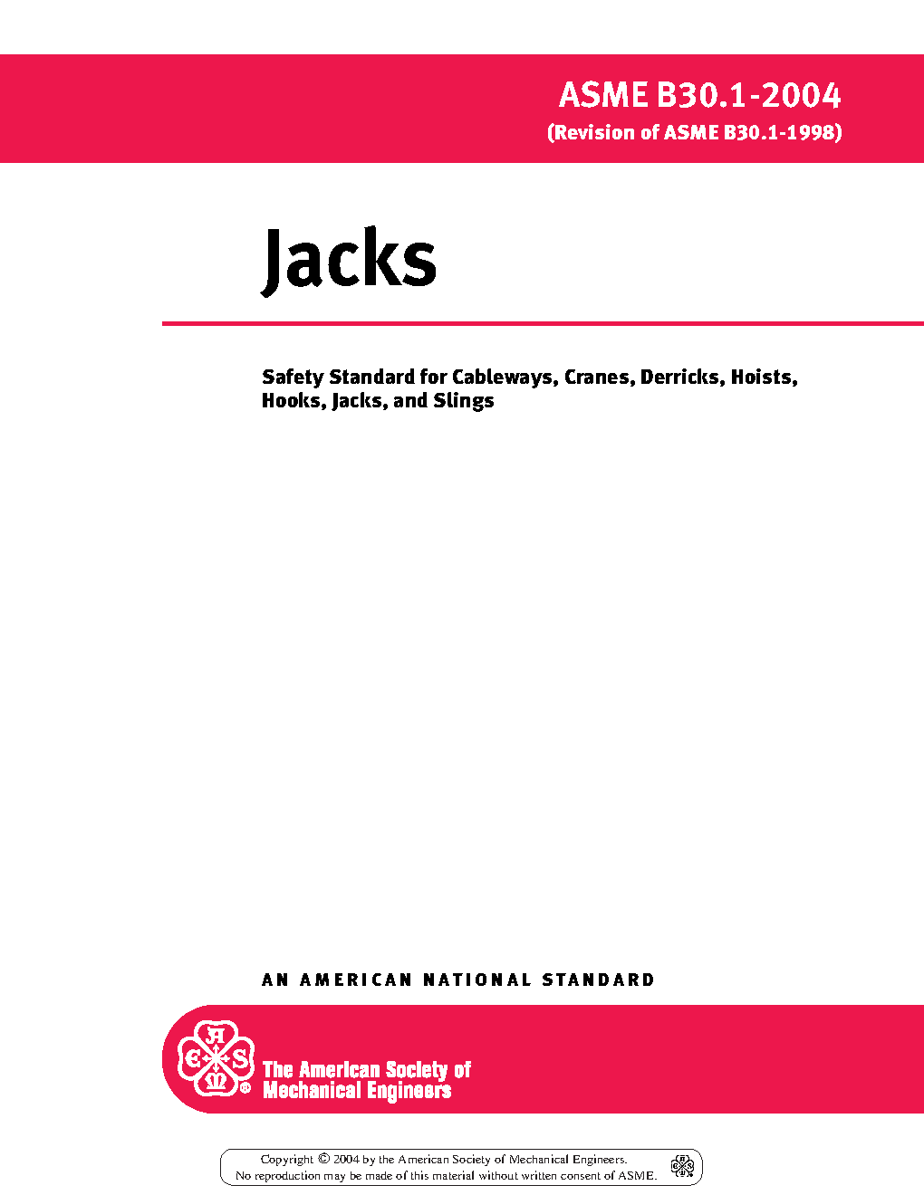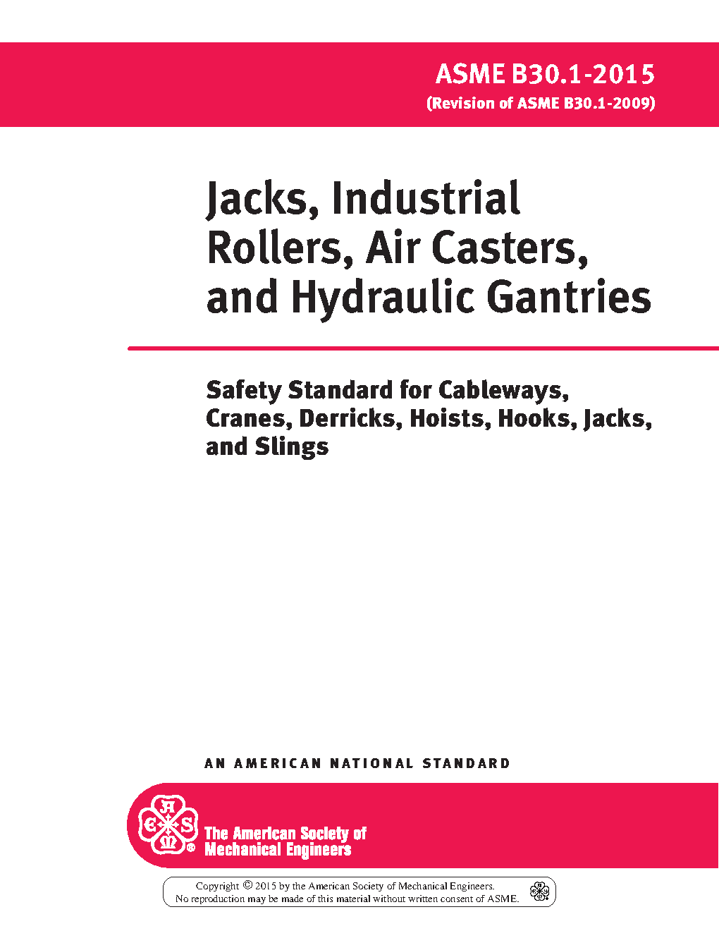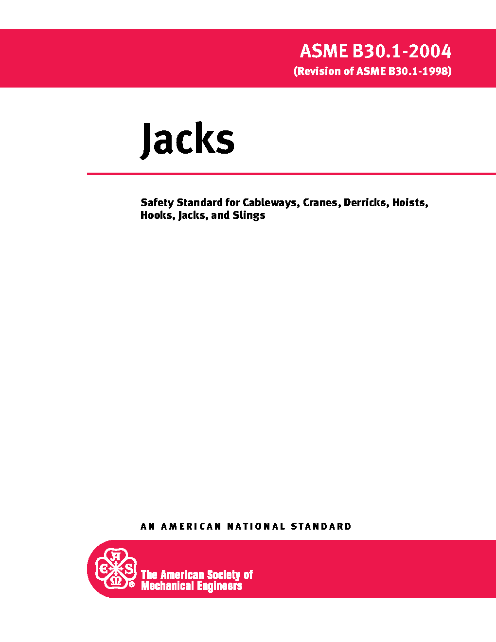 Volume B30.1 includes provisions that apply to the construction, operation, inspection, testing, and maintenance of mechanical ratchet jacks, hand- or power-operated mechanical screw jacks, hand- or power-operated hydraulic jacks, air lifting bags, industrial rollers, air casters, and telescopic hydraulic gantry systems. Not included in this Volume are jacks designed for automotive service, trip-lowered jacks, jacks designed for static support rather than lifting, and jacks, industrial rollers, air lifting bags or air casters that are an integral part of other equipment.