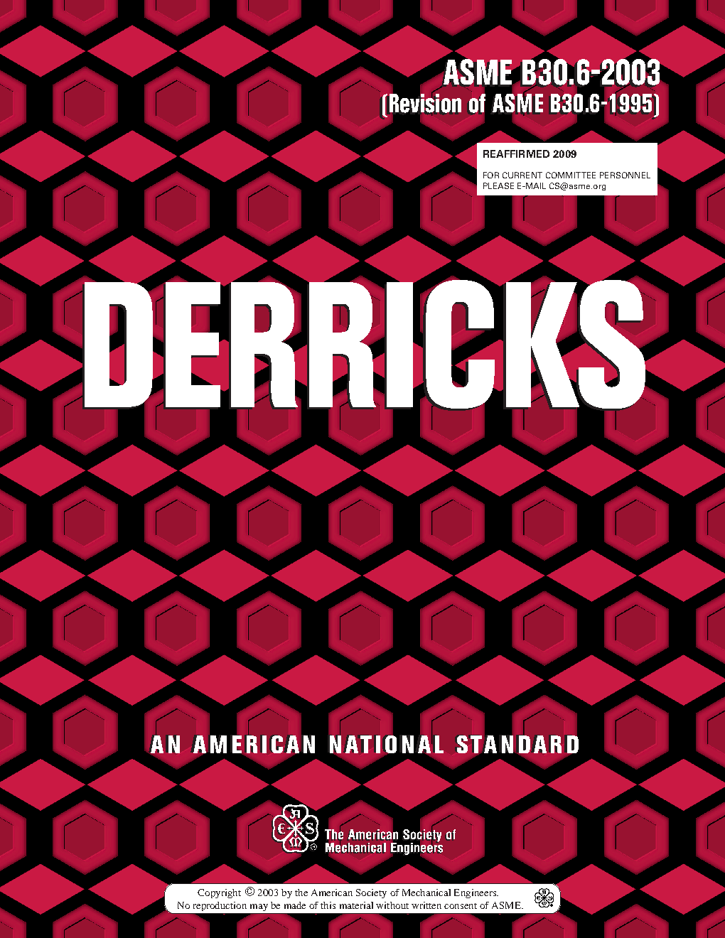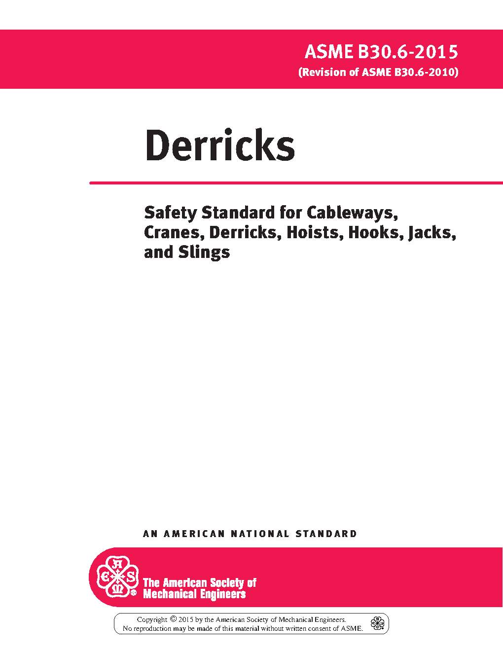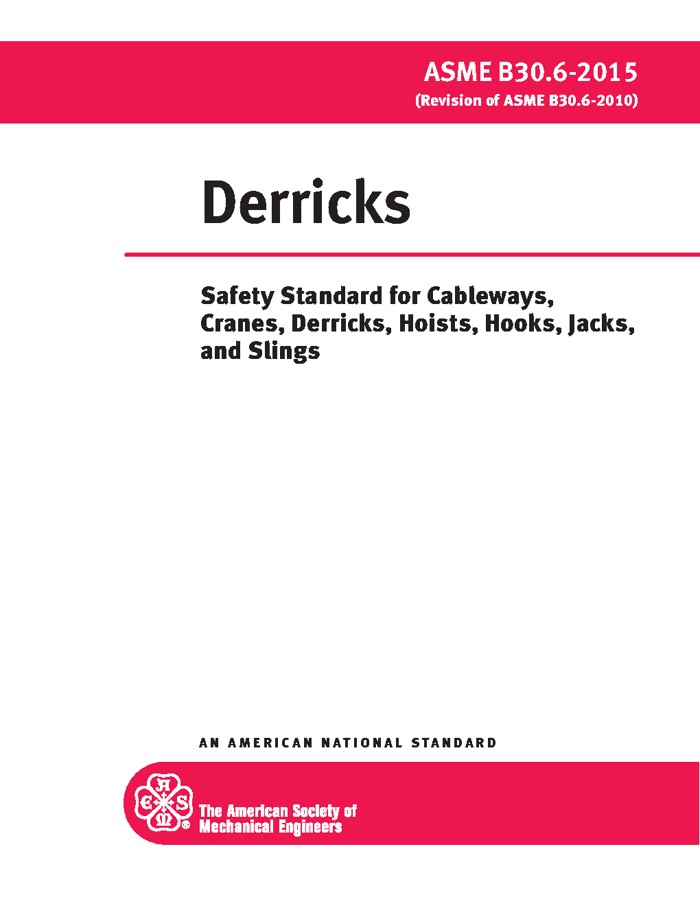 B30.6 applies to the construction, installation, operation, inspection, testing, and maintenance of guy, stiffleg, basket, breast, gin pole, Chicago boom, shearleg, and A-frame derricks. These derricks, powered by winches through systems of wire rope reeving, are used for lifting, lowering, and horizontal movement of freely suspended unguided loads. Derricks are usually stationary mounted and may be temporarily or permanently installed. The provisions included in this volume also apply to any variations of these types of derricks with the same fundamental characteristics, except those specified for floating derricks in ASME B30.8, Floating Cranes and Floating Derricks.