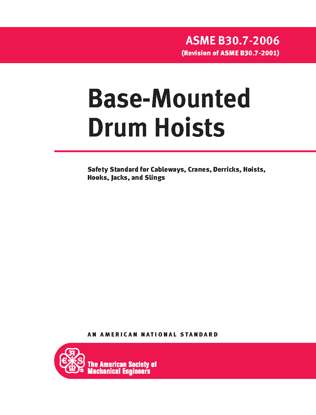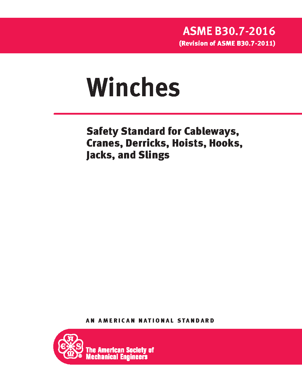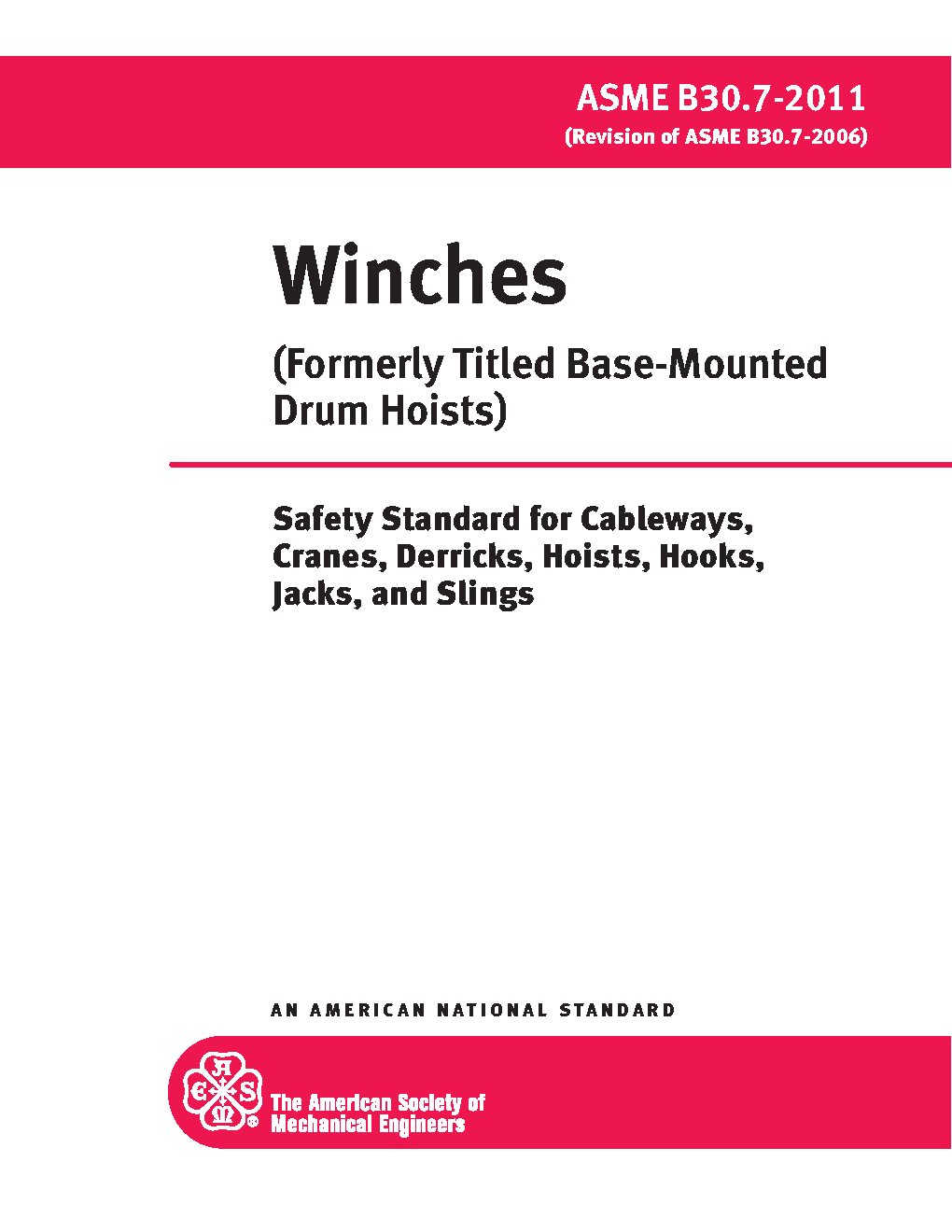 B30.7 includes provisions that apply to the construction, installation, operation, inspection, testing and maintenance of winches arranged for mounting on a foundation or other supporting structure for moving loads. Winches addressed in this volume are those typically used in industrial, construction and maritime applications. The requirements included in this volume apply to winches that are powered by internal combustion engines, electric motors, compressed air or hydraulics and that utilize drums and rope.