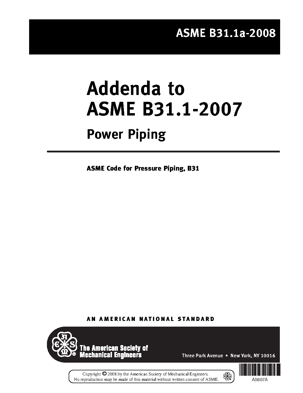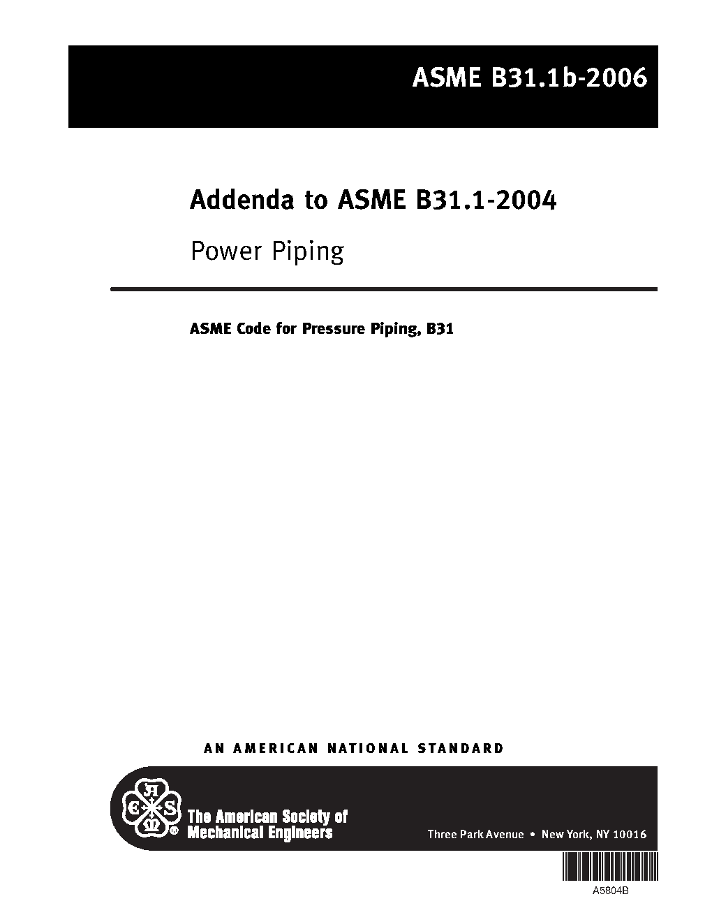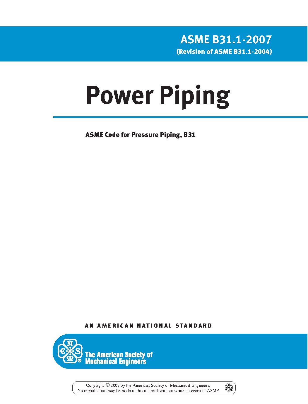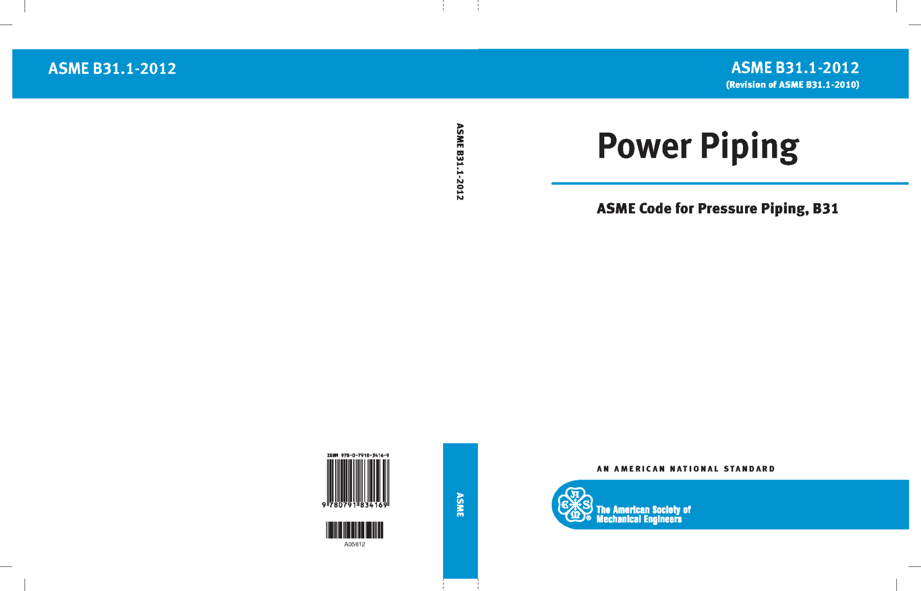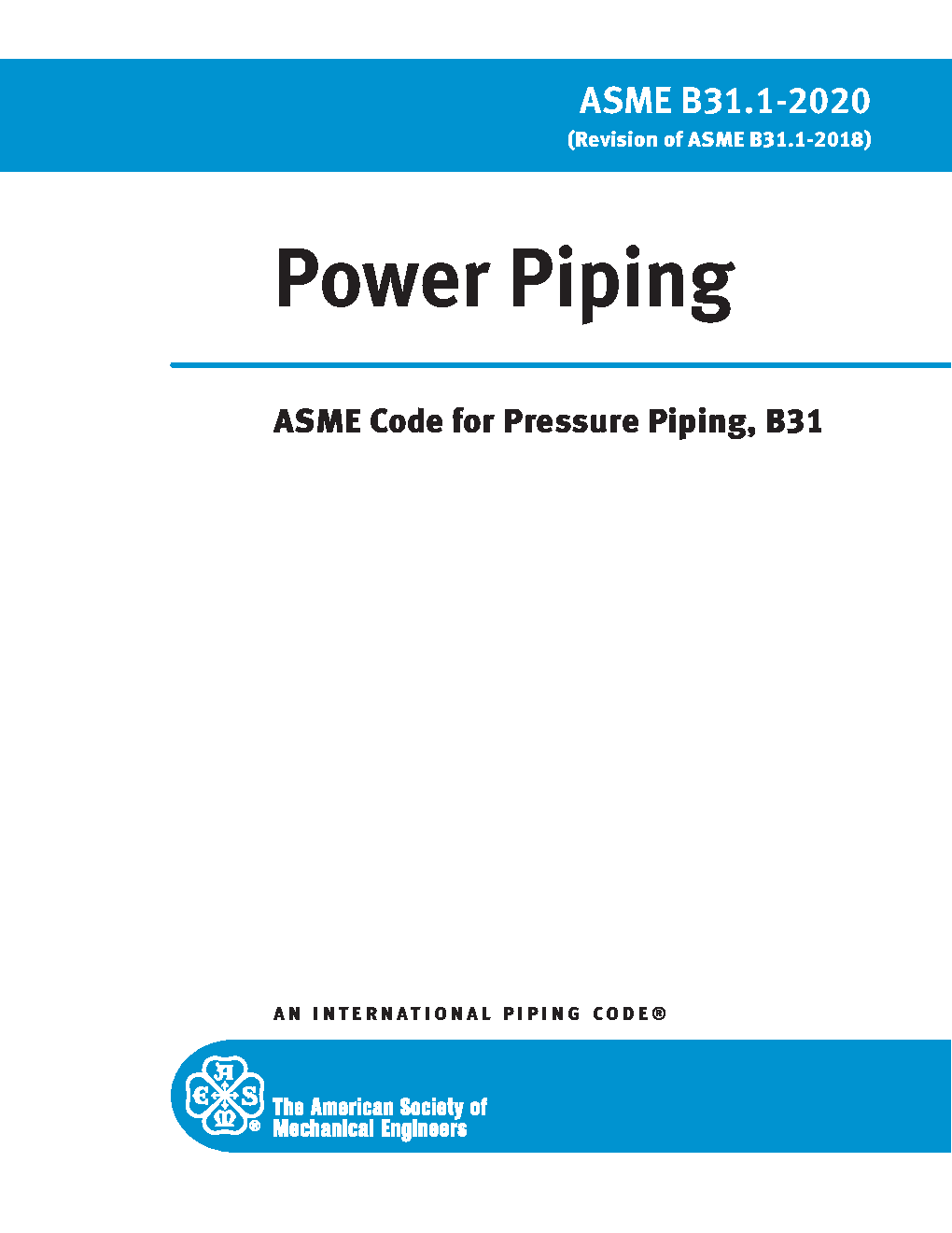 ASME B31.1 prescribes minimum requirements for the design, materials, fabrication, erection, test, examination, inspection, operation, and maintenance of piping systems typically found in electric power generating stations, industrial and institutional plants, geothermal heating systems, and central and district heating and cooling systems. It also covers boiler-external piping for power boilers and high-temperature, high pressure water boilers in which steam or vapor is generated at a pressure of more than 15 psig [100 kPa (gage)]; and high temperature water is generated at pressures exceeding 160 psig [1,103 kPa (gage)] and/or temperatures exceeding 250 degrees F (120 degrees C). ASME B31.1 is one of ASME's most requested codes, widely adopted by jurisdictions worldwide. It is prominently referenced in ASME's Boiler and Pressure Vessel Code, Section I. This Code serves as a companion to ASME's B31.3 Code on Process Piping as well as to the other codes in ASME's B31 series. Together, they remain essential references for anyone engaged with piping. Intended for manufacturers, designers, operators and owners of piping systems including, but not limited to, steam, water, oil, gas, and air services, plus all potential governing entities.