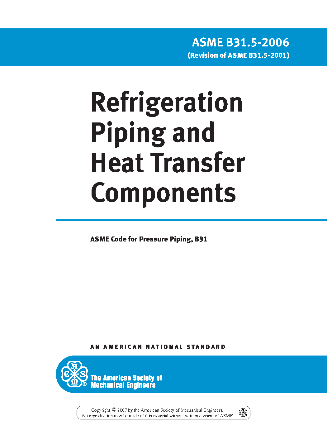 ASME B31.5 covers refrigerant, heat transfer components, and secondary coolant piping for temperatures as low as -320F (-196C), whether erected on the premises or factory assembled. Users are advised that other piping Code Sections may provide requirements for refrigeration piping in their respective jurisdictions. This Code does not apply to any self-contained or unit systems subject to the requirements of Underwriters Laboratories or other nationally recognized testing laboratory. It also does not apply to water piping; piping designed for external or internal gage pressure not exceeding 15 psi (105 kPa) regardless of size; or pressure vessels, compressors, or pumps. However, B31.5 does include all connecting refrigerant and secondary coolant piping starting at the first joint adjacent to such apparatus. Key changes to this revision include a new section on ultrasonic testing and revisions to paragraphs within the impact testing requirements of materials. B31.5 prescribes comprehensive solutions for materials, design, fabrication, assembly, erection, testing and inspection. It also serves as a companion to ASME's B31.1 Code on Power Piping as well as to the other codes in ASME's B31 series. Together, they remain essential references for anyone engaged with piping.