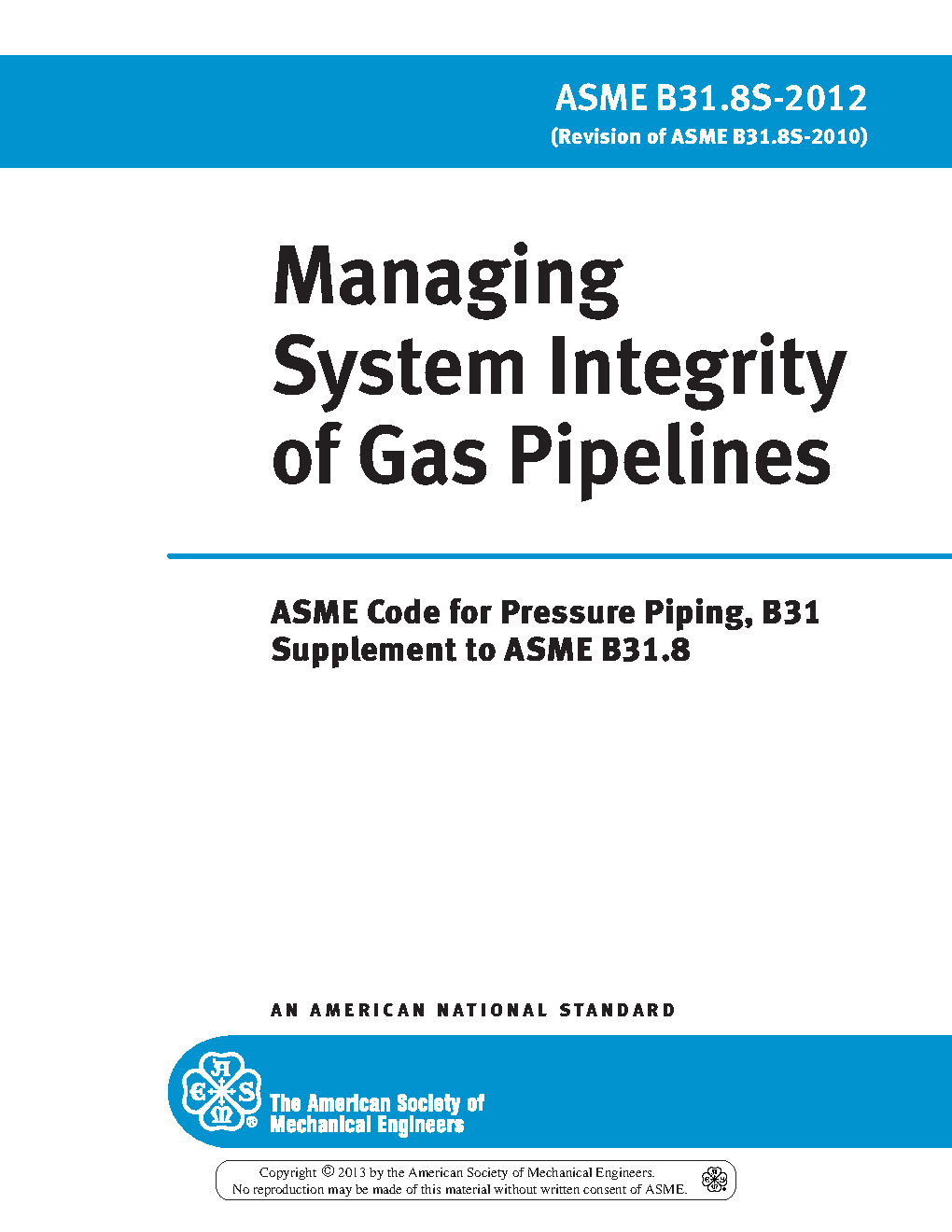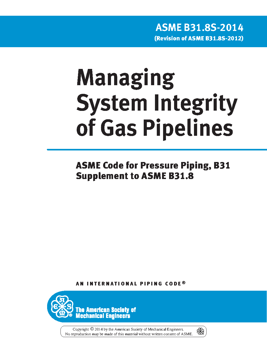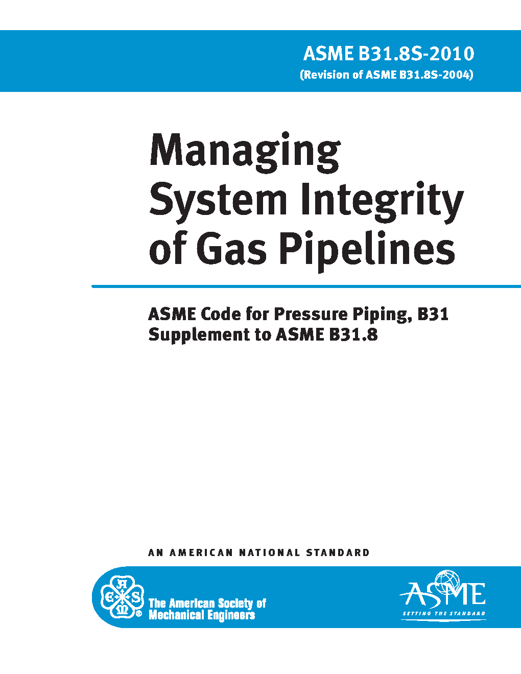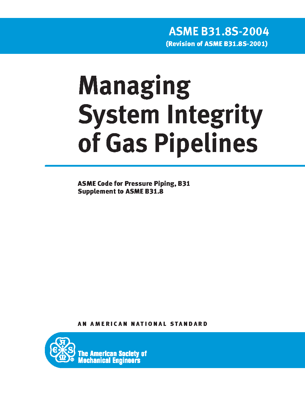 ASME's B31.8S Managing System Integrity of Gas Pipelines covers on-shore, gas pipeline systems constructed with ferrous materials, including pipe, valves, appurtenances attached to pipe, compressor units, metering stations, regulator stations, delivery stations, holders and fabricated assemblies. Its principles, processes and approaches apply to the entire system for all pipeline systems. B31.8S is specifically designed to provide the operator with the information necessary to develop and implement an effective integrity management program utilizing proven industry practices and processes. Effective system management can decrease repair and replacement costs, prevent malfunctions, and minimize system downtime.