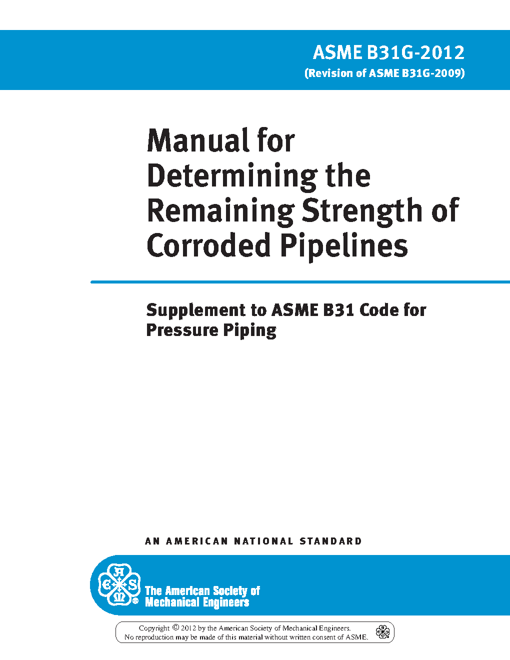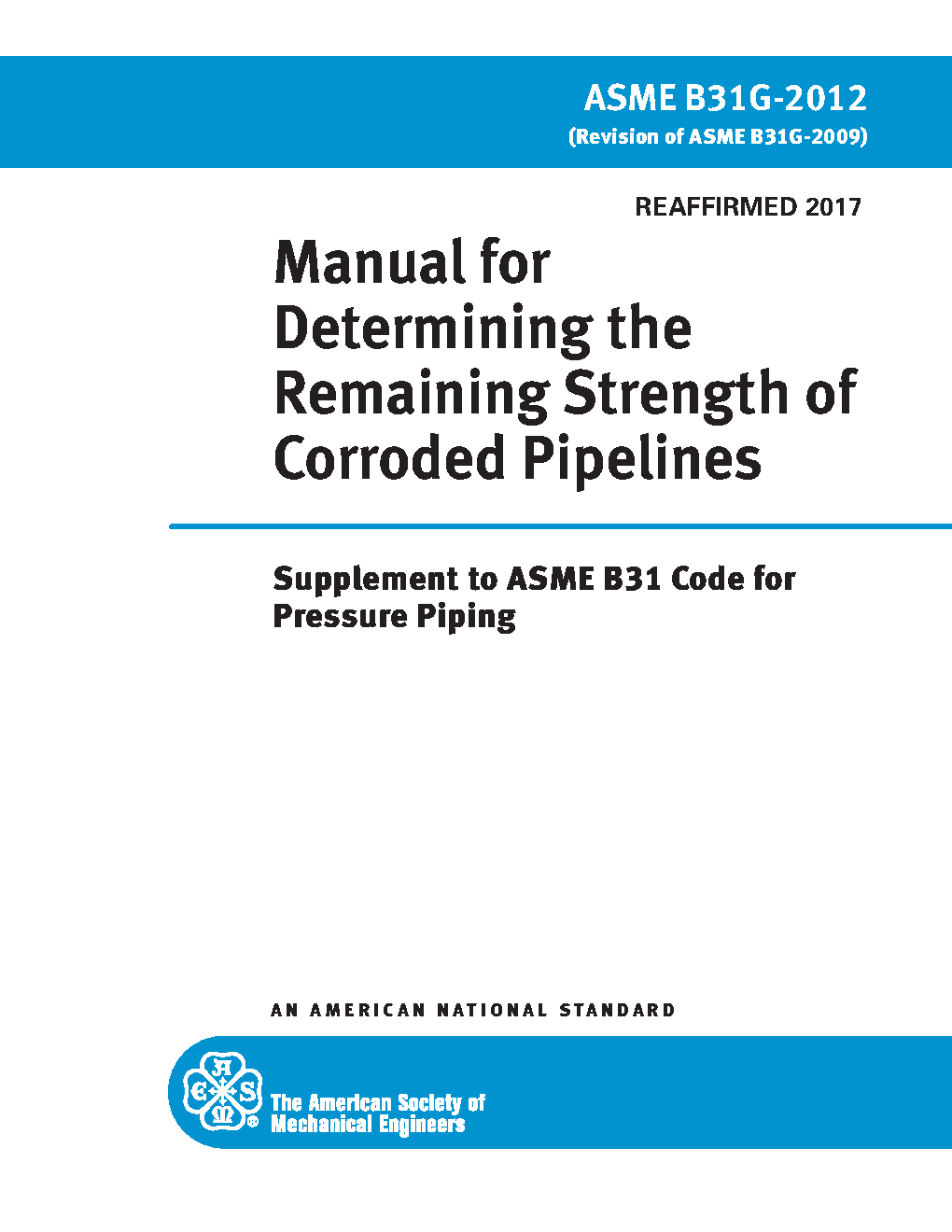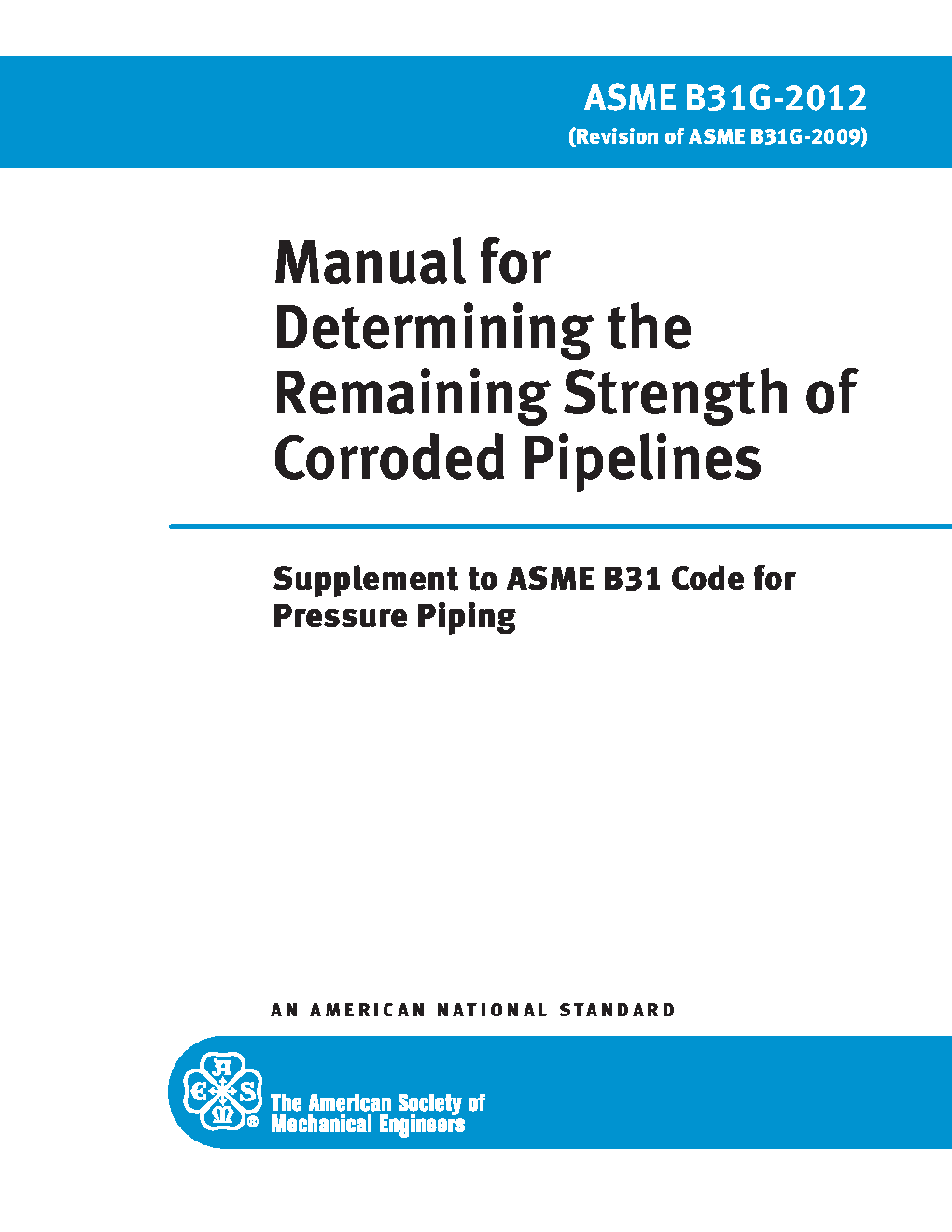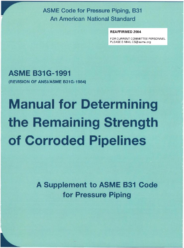 This document is intended solely for the purpose of providing guidance in the evaluation of metal loss in pressurized pipelines and piping systems. It is applicable to all pipelines and piping systems within the scope of the transportation pipeline codes that are part of ASME B31 Code for Pressure Piping, namely: ASME B31.4, Pipeline Transportation Systems for Liquid Hydrocarbons and Other Liquids; ASME B31.8, Gas Transmission and Distribution Piping Systems; ASME B31.11, Slurry Transportation Piping Systems; and ASME B31.12, Hydrogen Piping and Pipelines, Part PL. Where the term "pipeline" is used, it may also be read to apply to piping or pipe conforming to the acceptable applications and within the technical limitations discussed below.