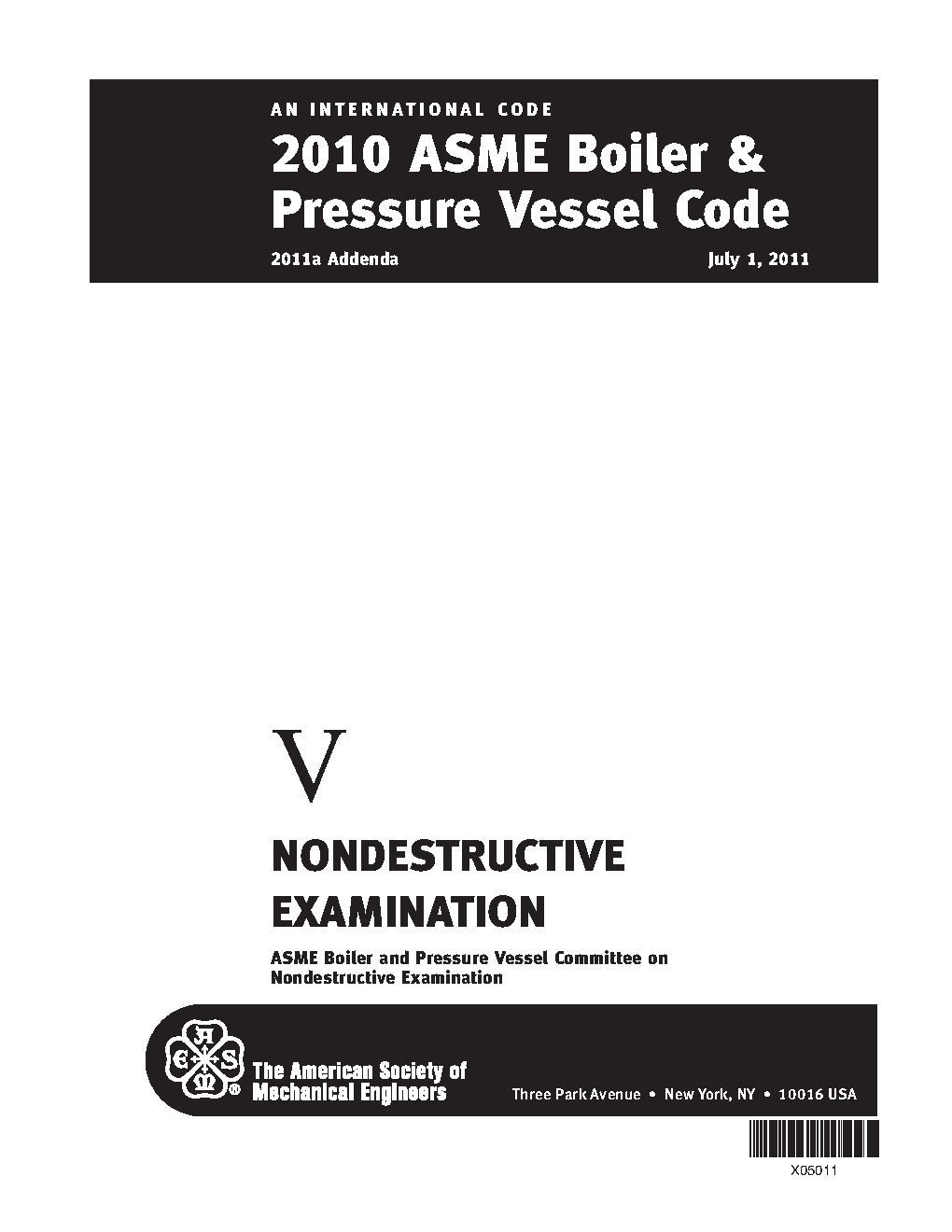 This Section contains requirements and methods for nondestructive examination which are referenced and required by other BPVC Sections. It also includes manufacturer's examination responsibilities, duties of authorized inspectors and requirements for qualification of personnel, inspection and examination. Examination methods are intended to detect surface and internal discontinuities in materials, welds, and fabricated parts and components. A glossary of related terms is included. Careful application of this Section will help users to comply with applicable regulations within their jurisdictions, while achieving the operational, cost and safety benefits to be gained from the many industry best-practices detailed within these volumes.