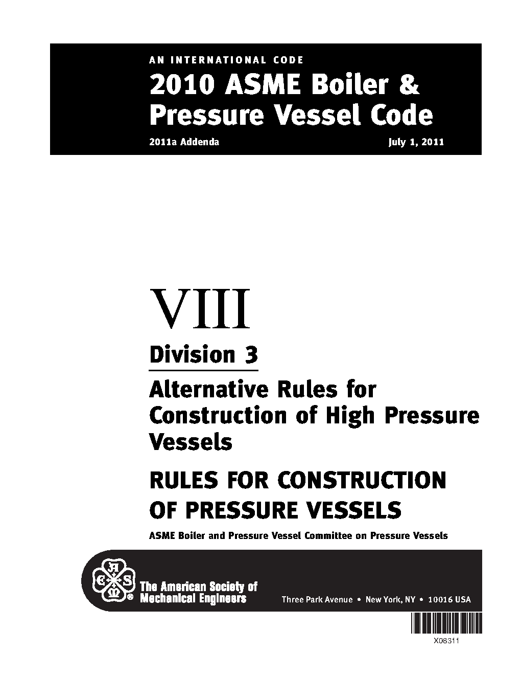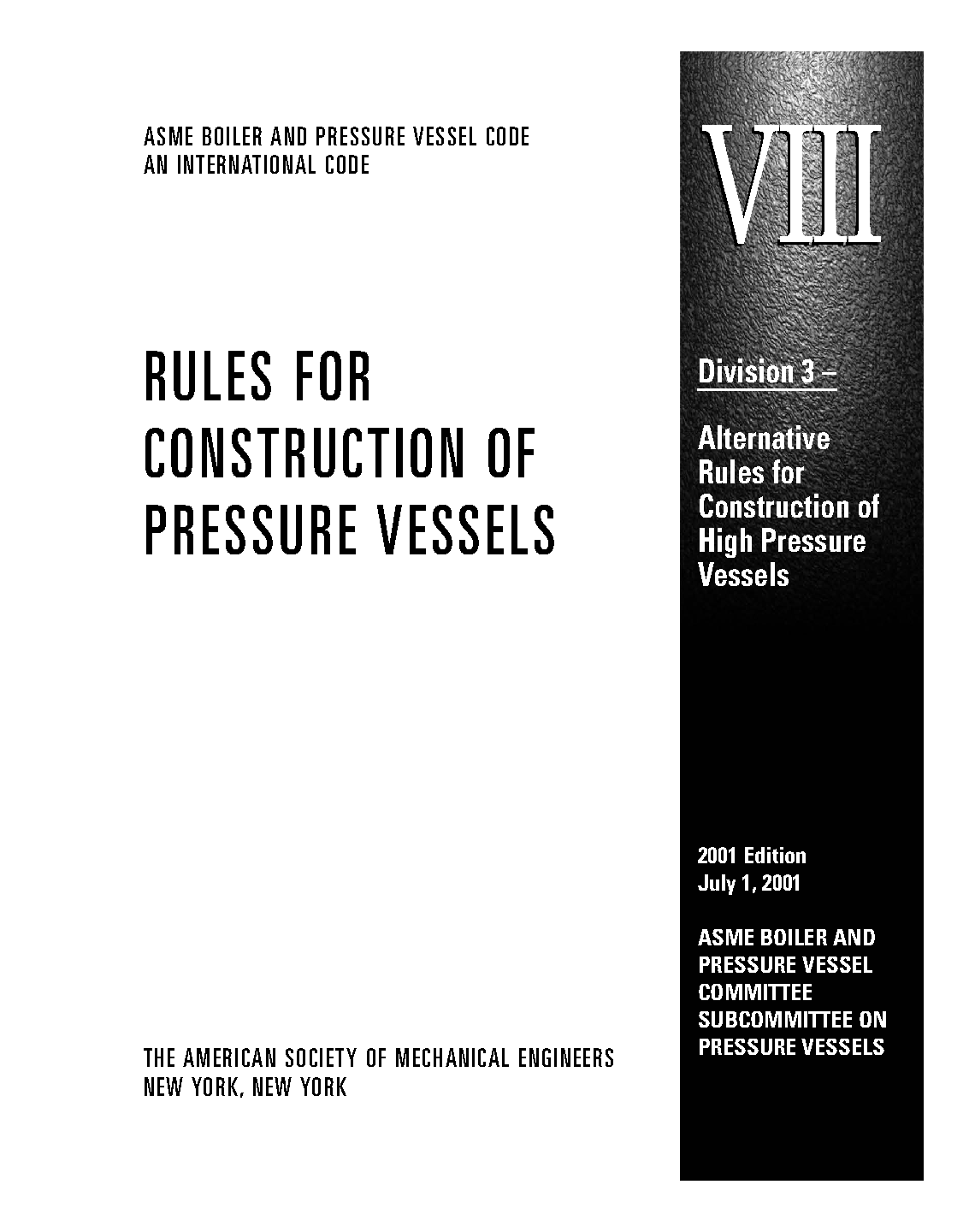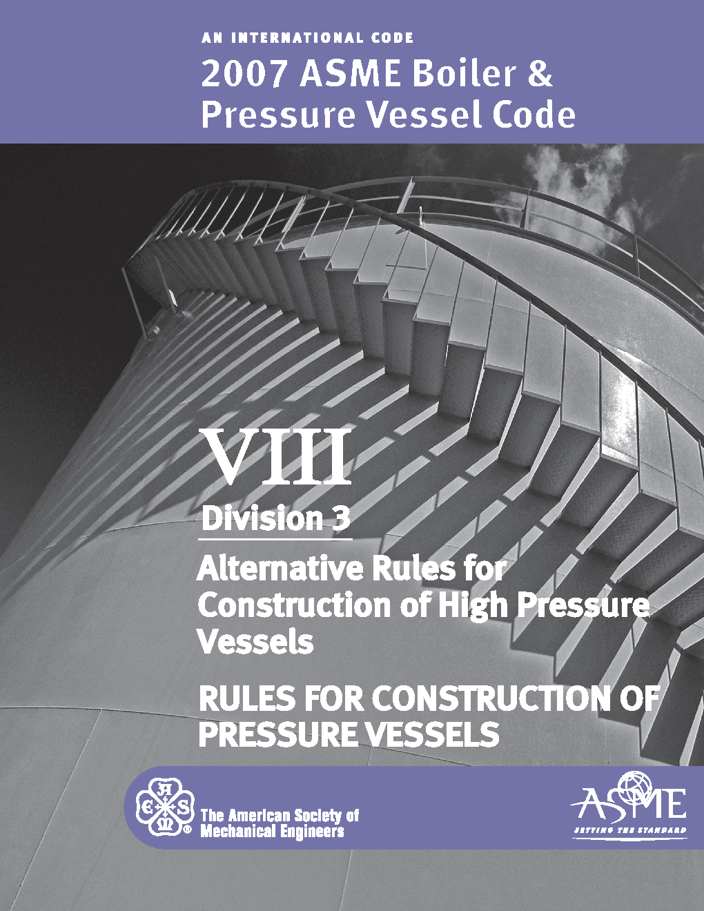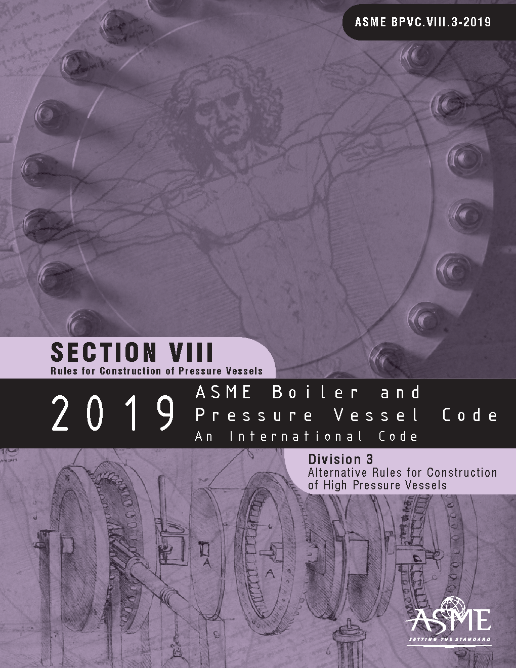 This Division of Section VIII provides requirements applicable to the design, fabrication, inspection, testing, and certification of pressure vessels operating at either internal or external pressures generally above 10,000 psi. Such vessels may be fired or unfired. This pressure may be obtained from an external source, a process reaction, by the application of heat from a direct or indirect source, or any combination thereof. Division 3 rules cover vessels intended for a specific service and installed in a fixed location or relocated from work site to work site between pressurizations. The operation and maintenance control is retained during the useful life of the vessel by the user who prepares or causes to be prepared the design specifications. Division 3 does not establish maximum pressure limits for either Section VIII, Divisions 1 or 2, nor minimum pressure limits for this Division. Rules pertaining to the use of the UV3 ASME Product Certification Marks are also included. Careful application of this Section will help users to comply with applicable regulations within their jurisdictions, while achieving the operational, cost and safety benefits to be gained from the many industry best-practices detailed within these volumes.