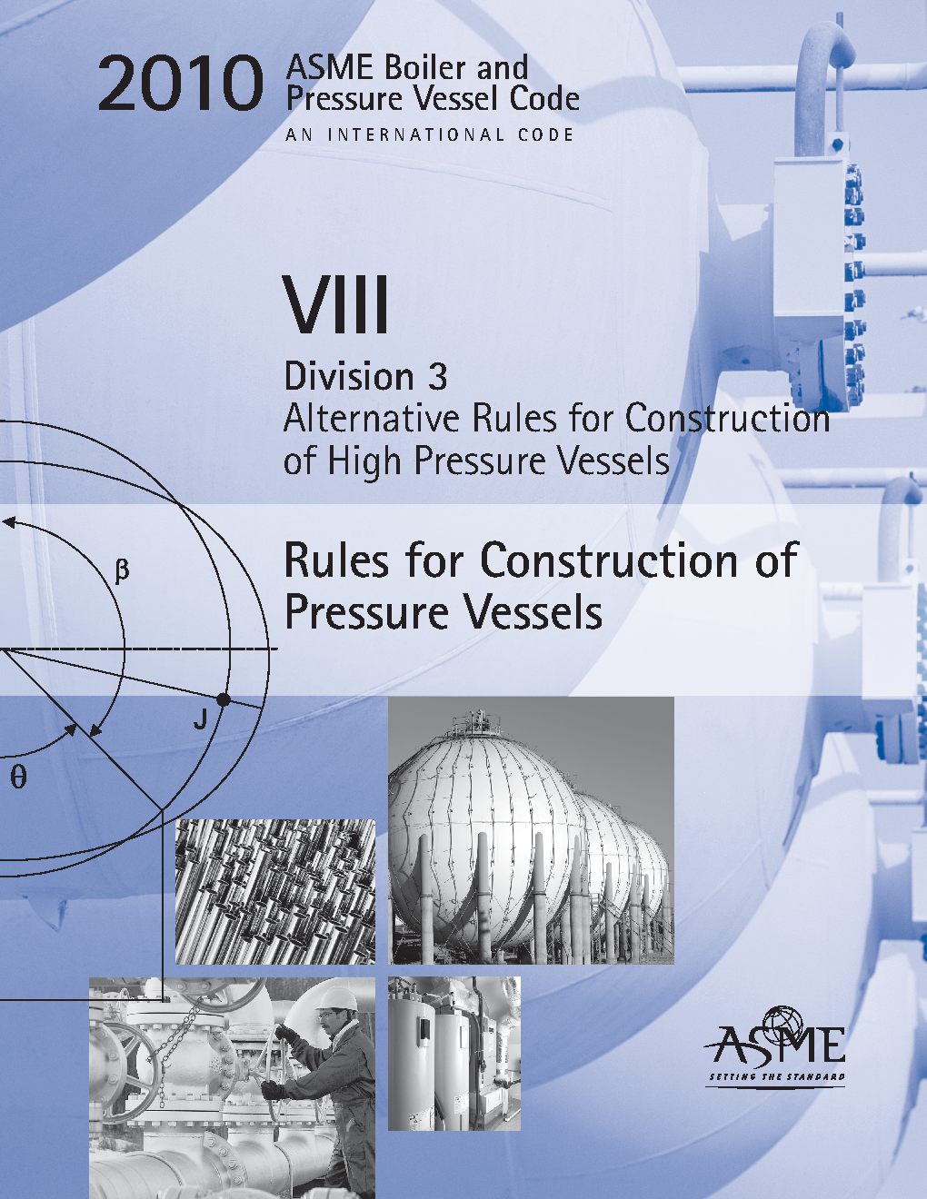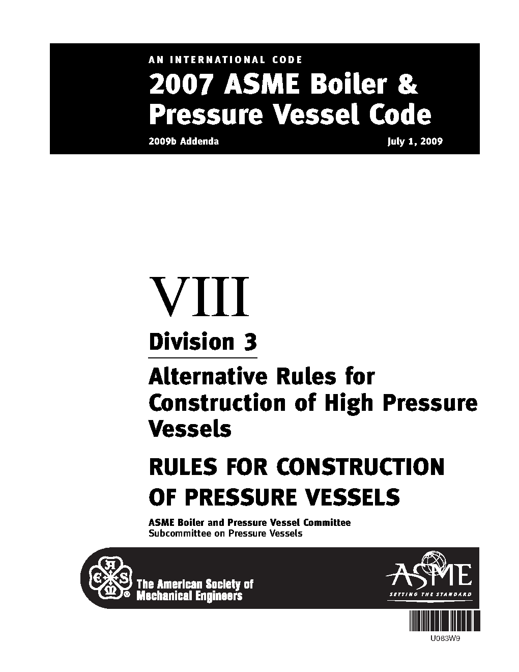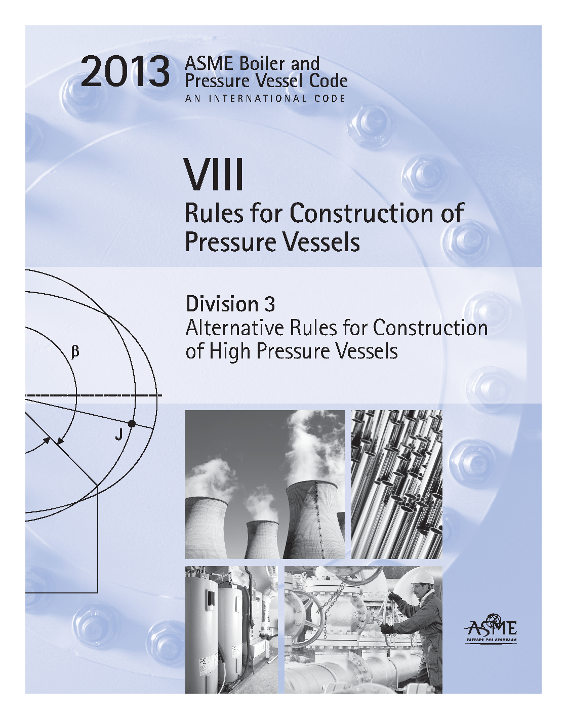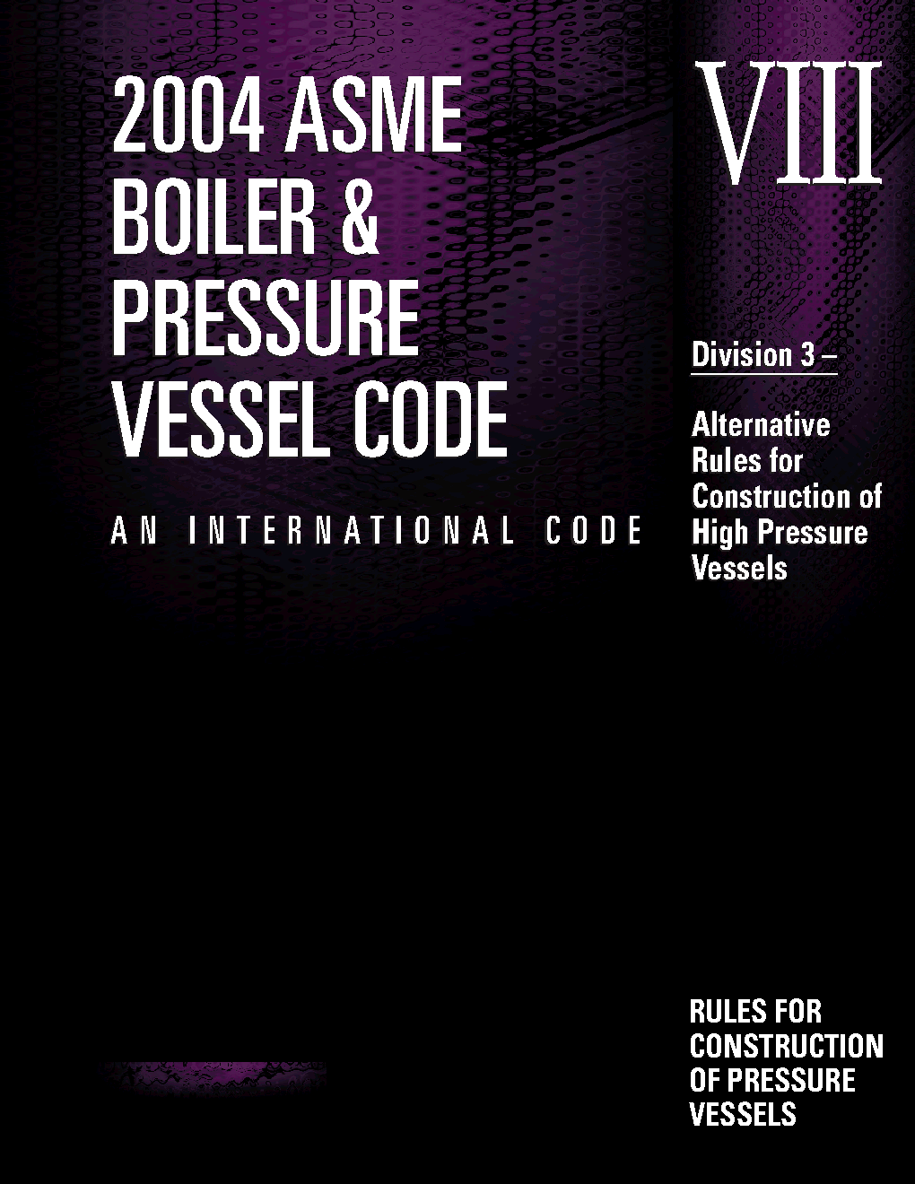 This Division of Section VIII provides requirements applicable to the design, fabrication, inspection, testing, and certification of pressure vessels operating at either internal or external pressures generally above 10,000 psi. Such vessels may be fired or unfired. This pressure may be obtained from an external source, a process reaction, by the application of heat from a direct or indirect source, or any combination thereof. Division 3 rules cover vessels intended for a specific service and installed in a fixed location or relocated from work site to work site between pressurizations. The operation and maintenance control is retained during the useful life of the vessel by the user who prepares or causes to be prepared the design specifications. Division 3 does not establish maximum pressure limits for either Section VIII, Divisions 1 or 2, nor minimum pressure limits for this Division. Rules pertaining to the use of the UV3 ASME Product Certification Marks are also included. Careful application of this Section will help users to comply with applicable regulations within their jurisdictions, while achieving the operational, cost and safety benefits to be gained from the many industry best-practices detailed within these volumes.
