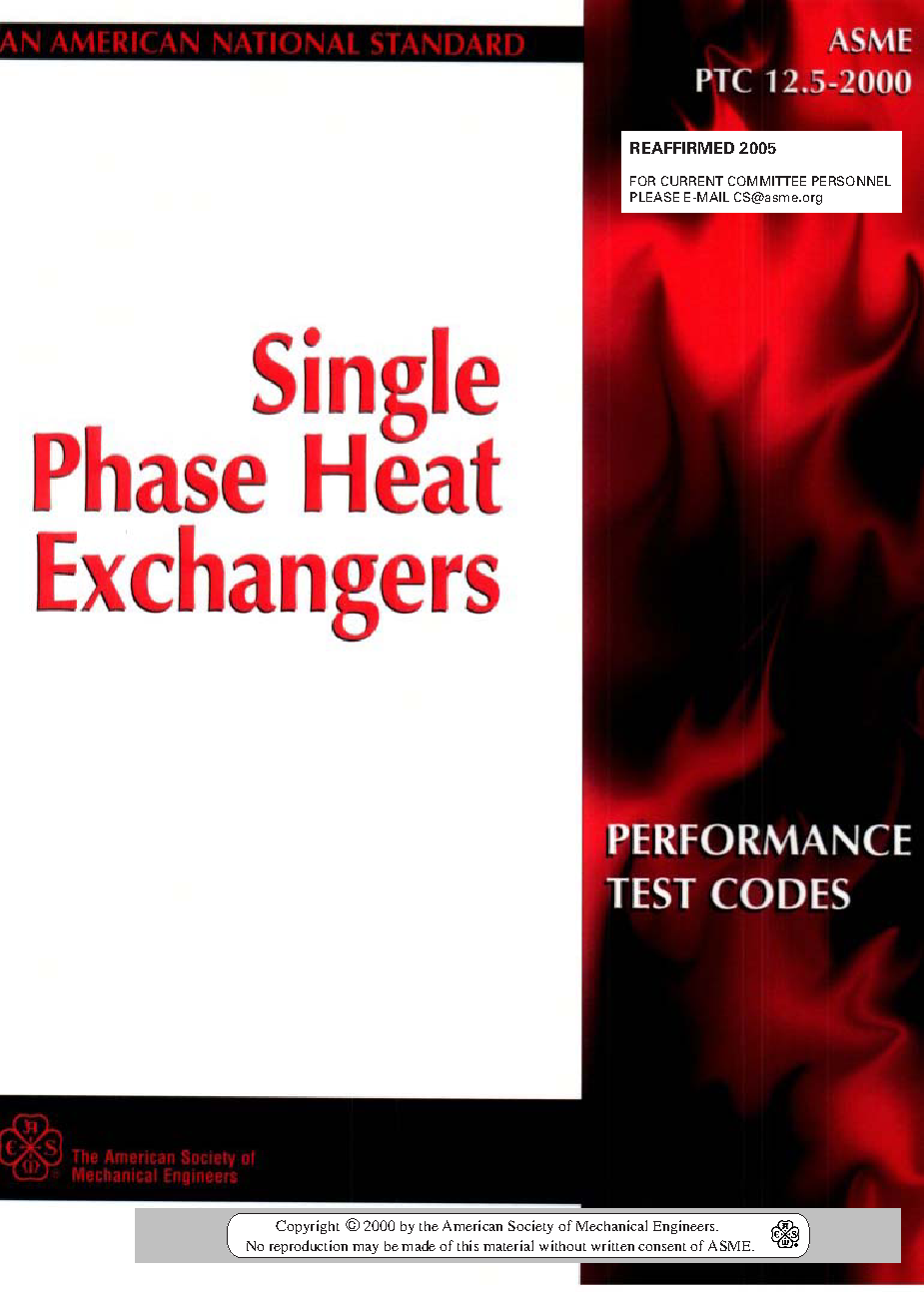 This Code provides methods and procedures for testing single phase heat exchangers. The Code presents and describes the methods for determining heat exchanger performance, for measuring fluid conditions and related phenomena, and for projecting performance parameters to reference conditions. Performance parameters included are overall heat transfer coefficient, heat transfer rate, and pressure drop. Guidelines are provided for recommended instrumentation and accuracy. The scope of this Code includes instruments, calculation techniques, and methods to determine the steady state performance of single phase heat exchangers at both test conditions and reference conditions. This Code applies to, but is not limited to, the following types of heat exchangers: (a) Shell-and-tube; (b) Plate-frame; (c) Plate-fin; and (d) Tube-in plate fin. Single-phase fluid streams, including liquid-to- liquid, gas-to-liquid, and gas-to-gas are included. Excluded from this Code are heat exchangers used in condensation, vaporization, fired, direct contact, non-newtonian fluid, and more than two-fluid applications. Supplementary information is included on (a) Steady state criteria; (b) Equations and coefficients for uncertainty analysis; (c) The Delaware Method for shell-side performance; (d) Mean temperature difference; (e) Derivation of performance equations; (f) Tube-side performance methods; (g) Fouling resistance; (h) Plate frame performance methods; (i) Thermal physical properties; (j) Room cooler performance methods; and (k) Examples.