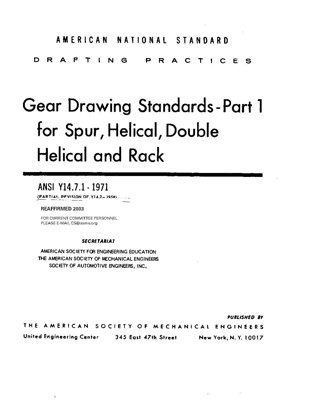 This standard is no longer an American National Standard or an ASME-approved standard. It is available for historical reference only. This Standard sets forth methods to be followed for specifying drawing data for gears operating on axes which are parallel. It is the purpose of this Standard to provide formats, nomenclature, and definitions for the following types of gears: Spur, Helical, Double-Helical, and Spur and Helical Racks. The minimum data for the various gear types are defined. Where additional data are required, methods for specifying these data are shown. Slight deviations for critical applications are recognized, provided general formats are maintained.