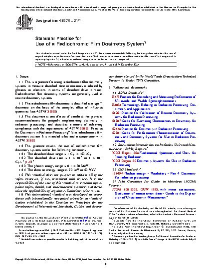 1.3 This document is one of a set of standards that provides recommendations for properly implementing dosimetry in radiation processing, and describes a means of achieving compliance with the requirements of ISO/ASTM 52628 “Practice for Dosimetry in Radiation Processing” for a radiochromic film dosimetry system. It is intended to be read in conjunction with ISO/ASTM 52628.