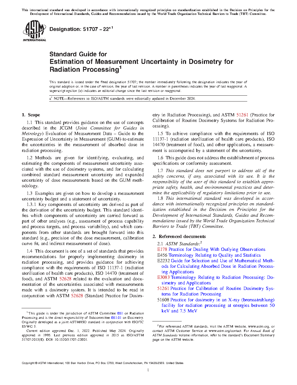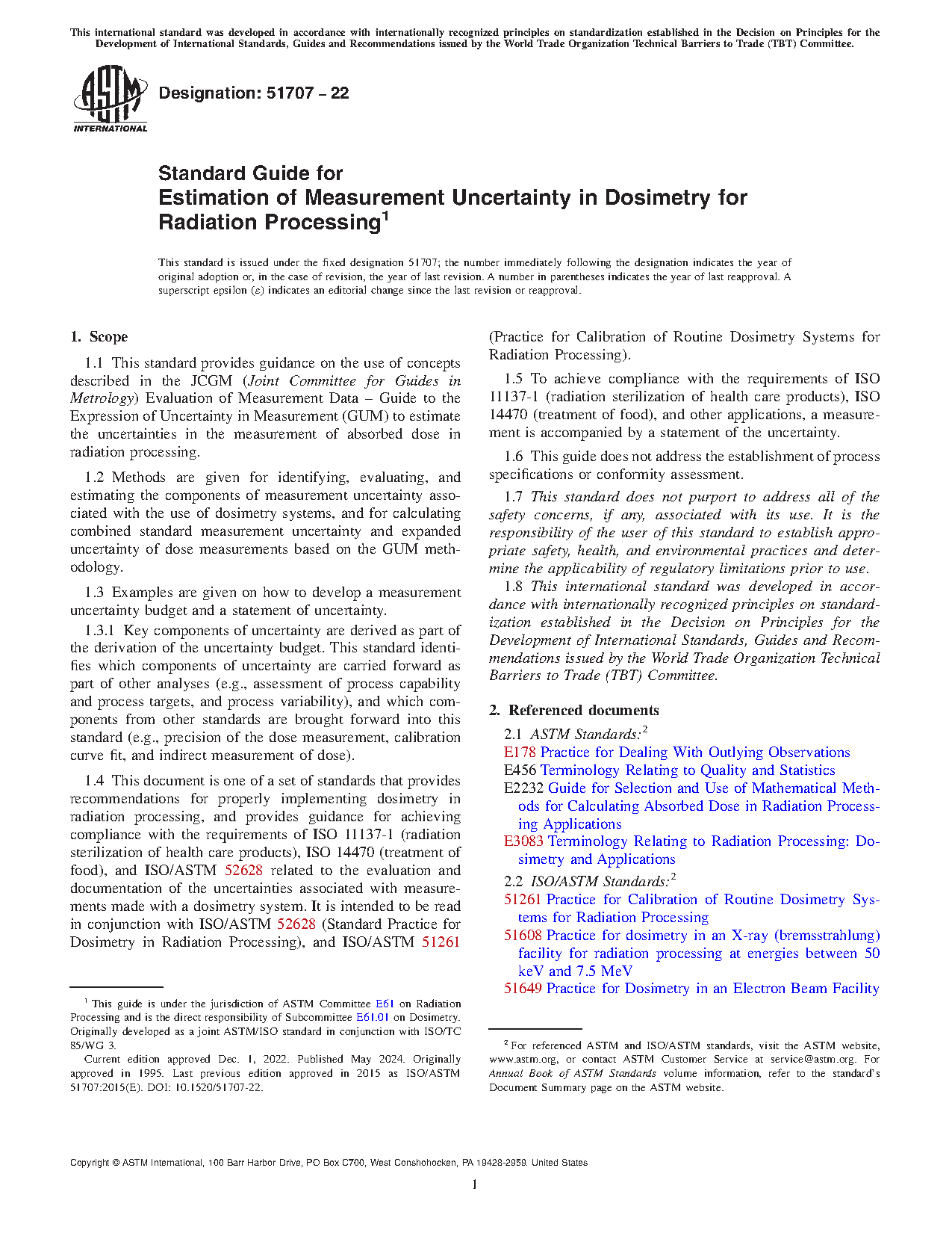 1.4 This document is one of a set of standards that provides recommendations for properly implementing dosimetry in radiation processing, and provides guidance for achieving compliance with the requirements of ISO 11137-1 (radiation sterilization of health care products), ISO 14470 (treatment of food), and ISO/ASTM 52628 related to the evaluation and documentation of the uncertainties associated with measurements made with a dosimetry system. It is intended to be read in conjunction with ISO/ASTM 52628 (Standard Practice for Dosimetry in Radiation Processing), and ISO/ASTM 51261 (Practice for Calibration of Routine Dosimetry Systems for Radiation Processing).