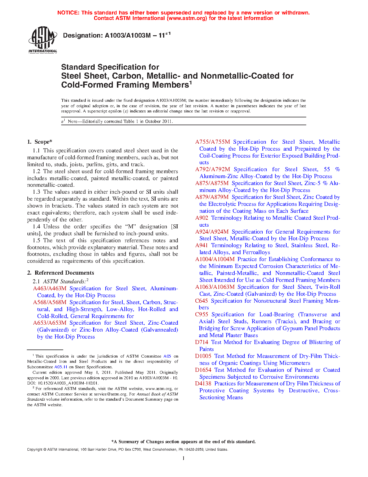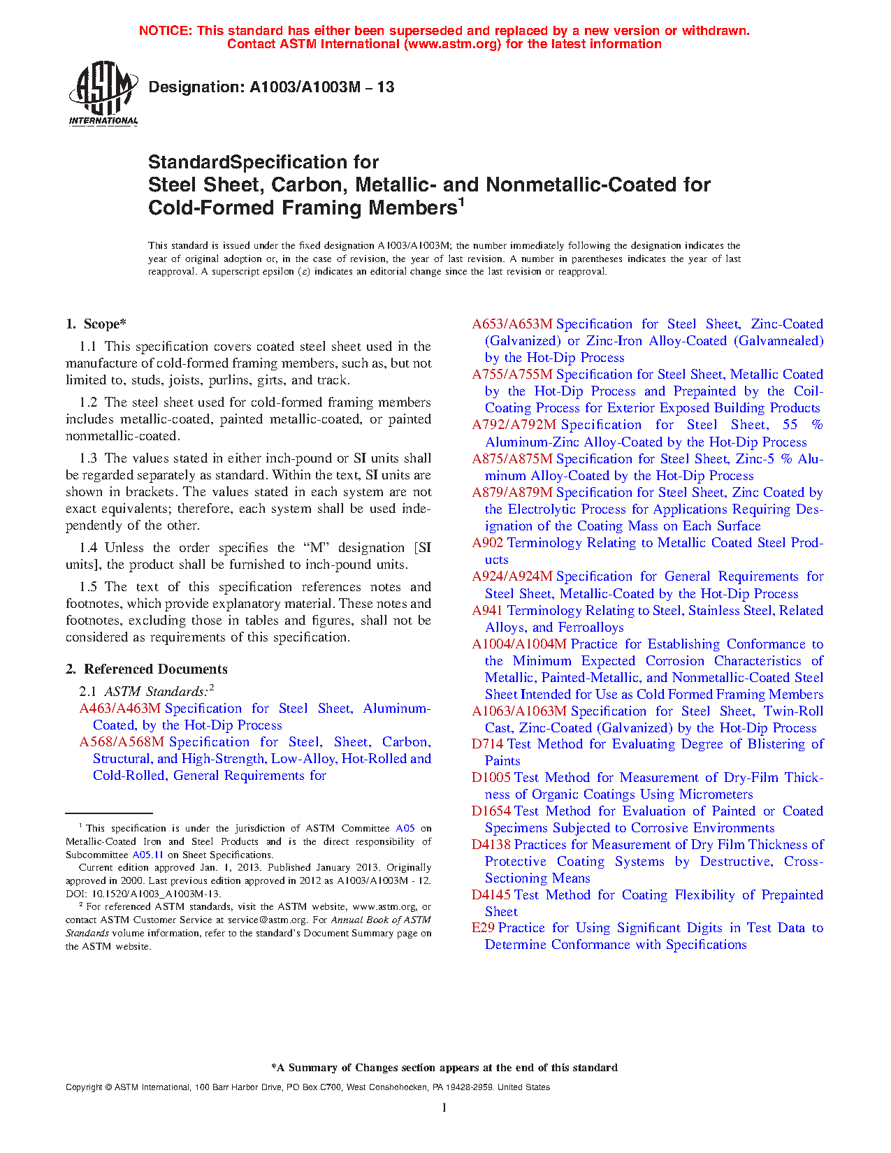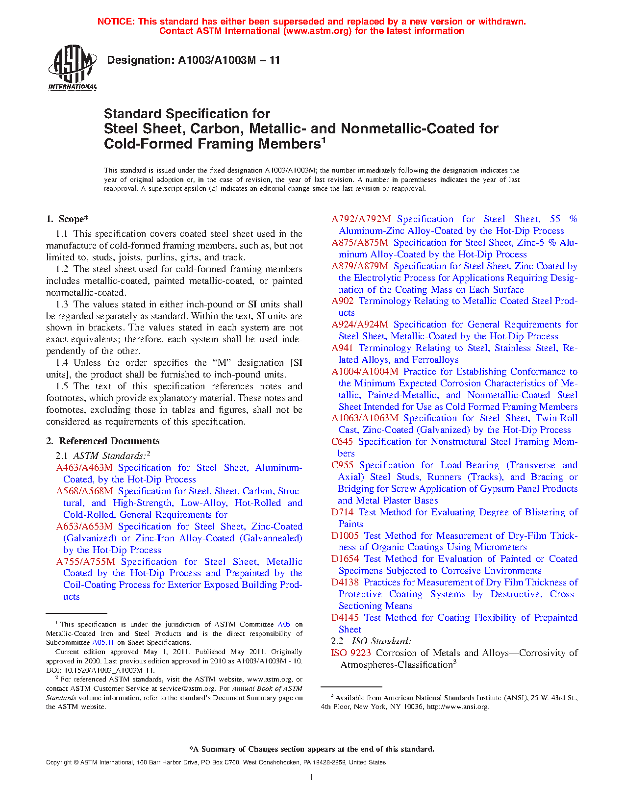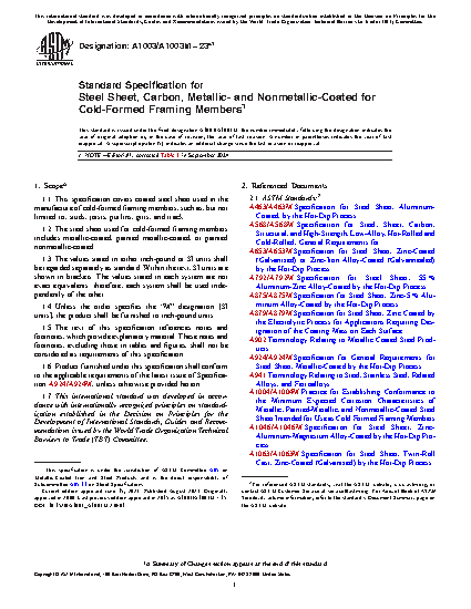 1.1 This specification covers coated steel sheet used in the manufacture of cold-formed framing members, such as, but not limited to, studs, joists, purlins, girts, and track.