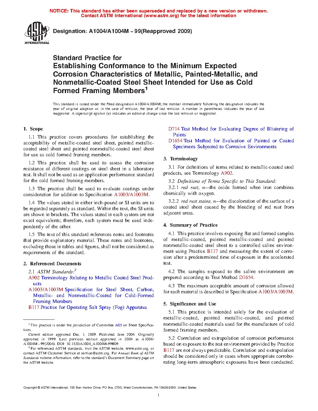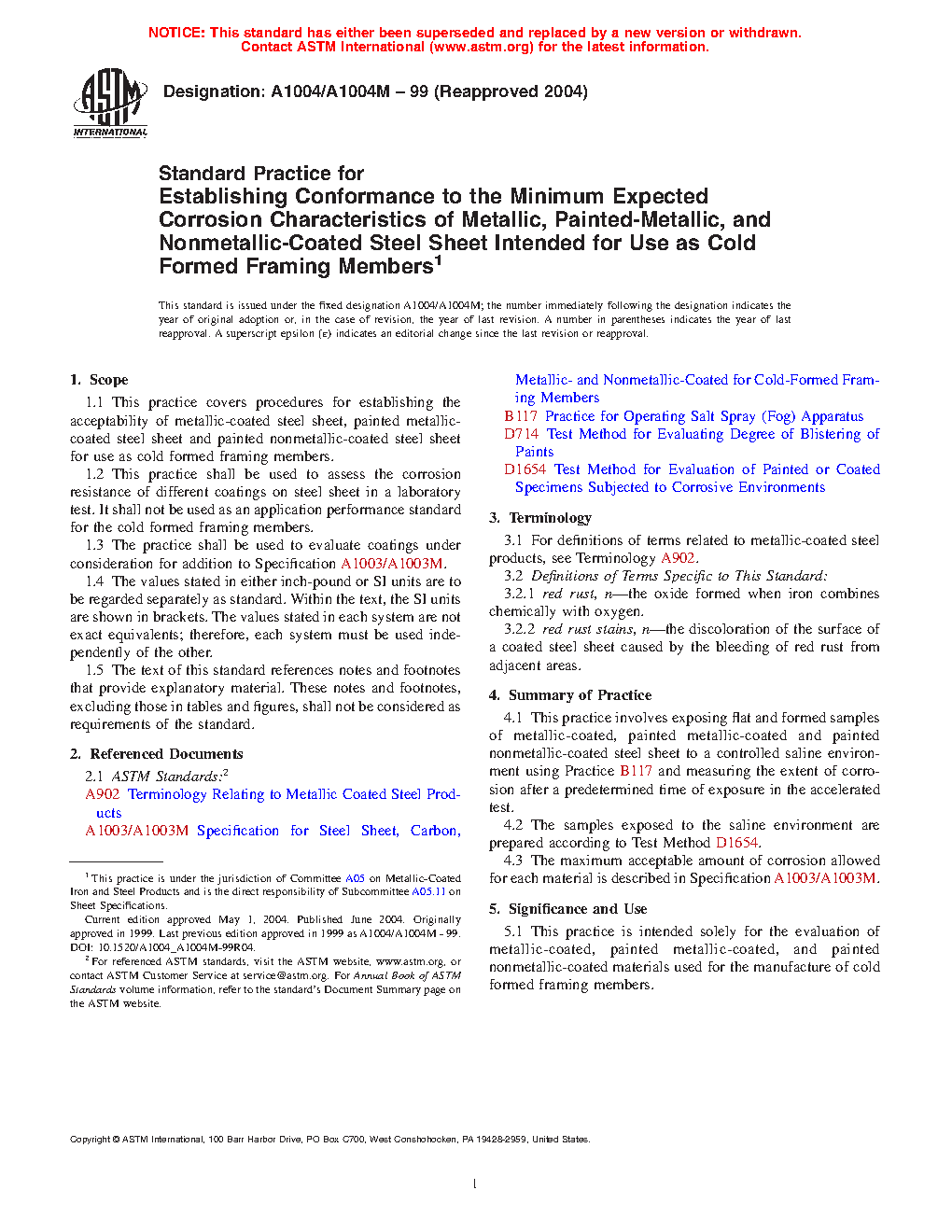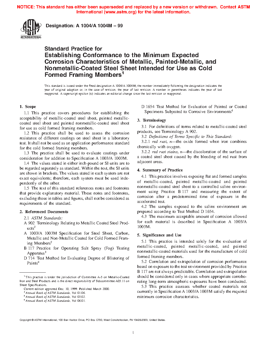 1.2 This practice shall be used to assess the corrosion resistance of different coatings on steel sheet in a laboratory test. It shall not be used as an application performance standard for the cold formed framing members.