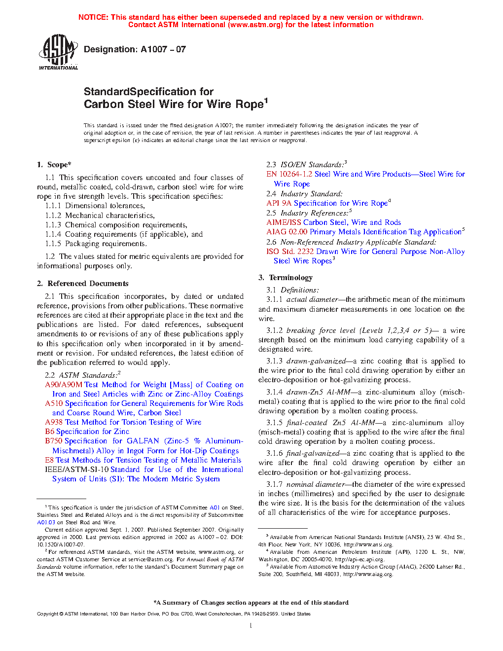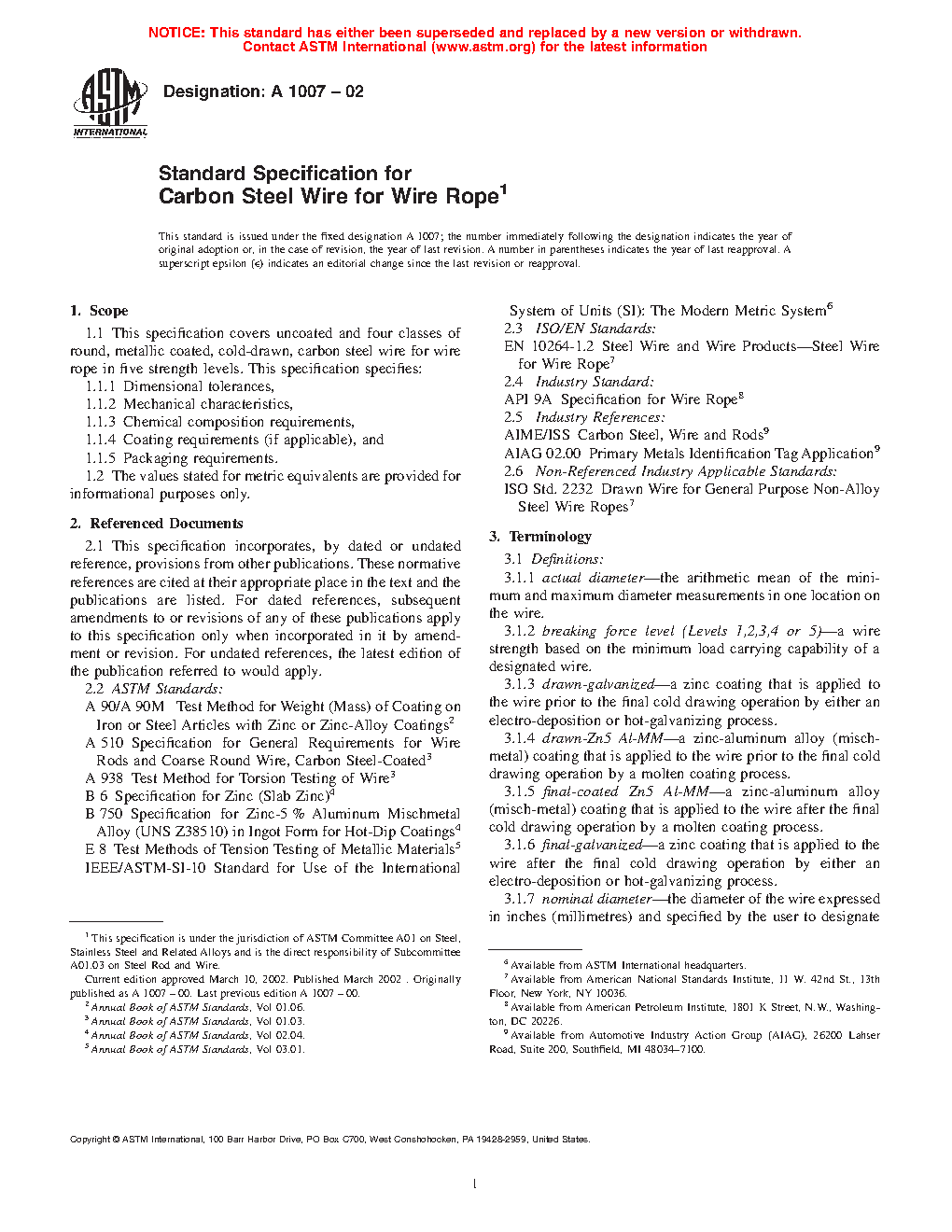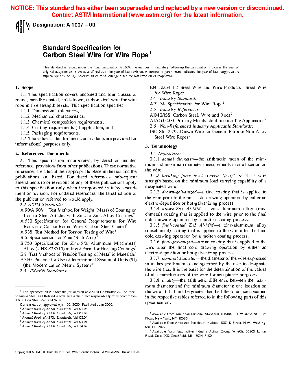 This specification covers uncoated and four classes of round, metallic coated, cold-drawn, carbon steel wire rope in five strength levels. The following materials testing procedures shall be conducted: standard tensile testing; alternate tensile testing; torsion testing; and wrap testing. The wire diameter tolerances of uncoated, drawn-galvanized or drawn-Zn5 Al-MM, and final-galvanized or final-coated Zn5 Al-MM rope wires shall be described. Minimum breakage forces for the carbon steel wire rope shall also be presented. During torsion testing, varying amounts of load shall be applied to the wire being tested.