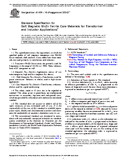 1.1 This specification covers the requirements to which the specified grades of soft magnetic manganese zinc (MnZn) ferrite materials shall conform. Cores made from these materials are used primarily in power transformers and filter inductors.