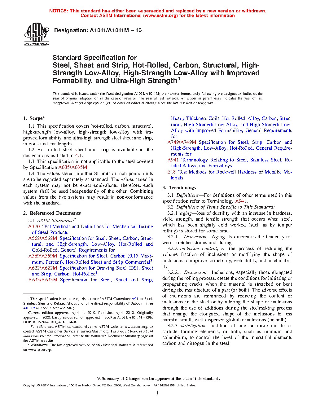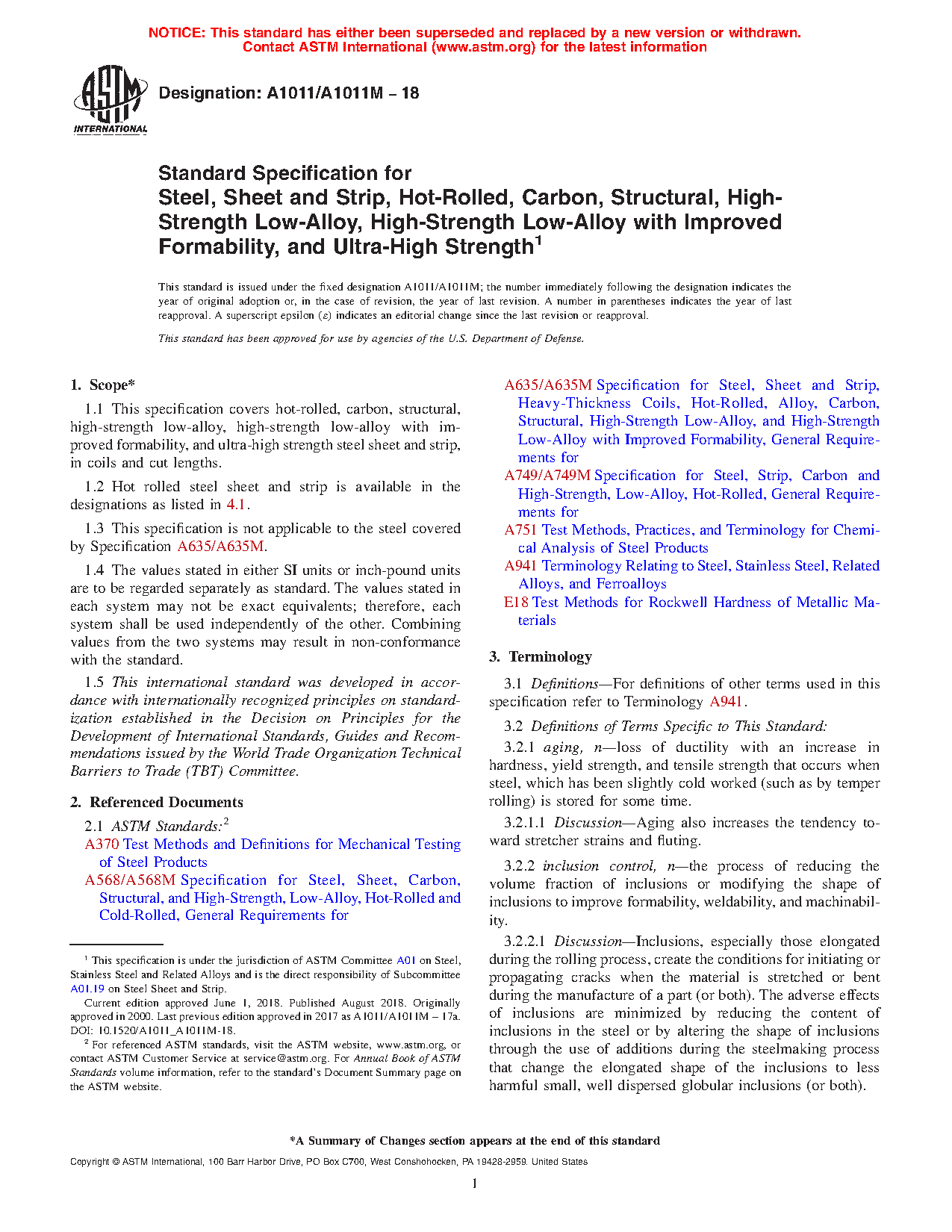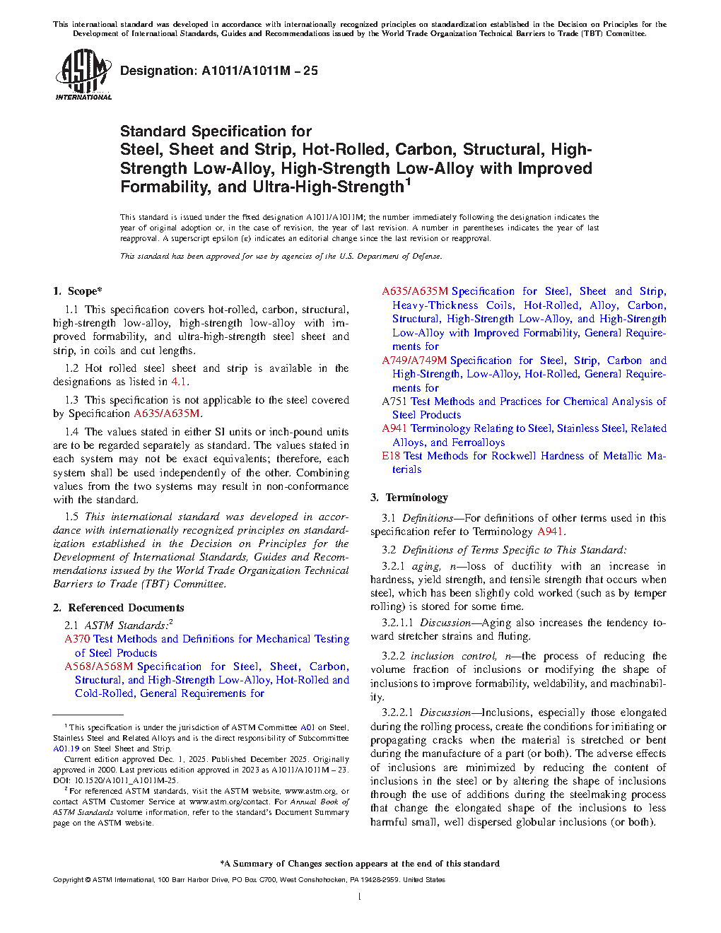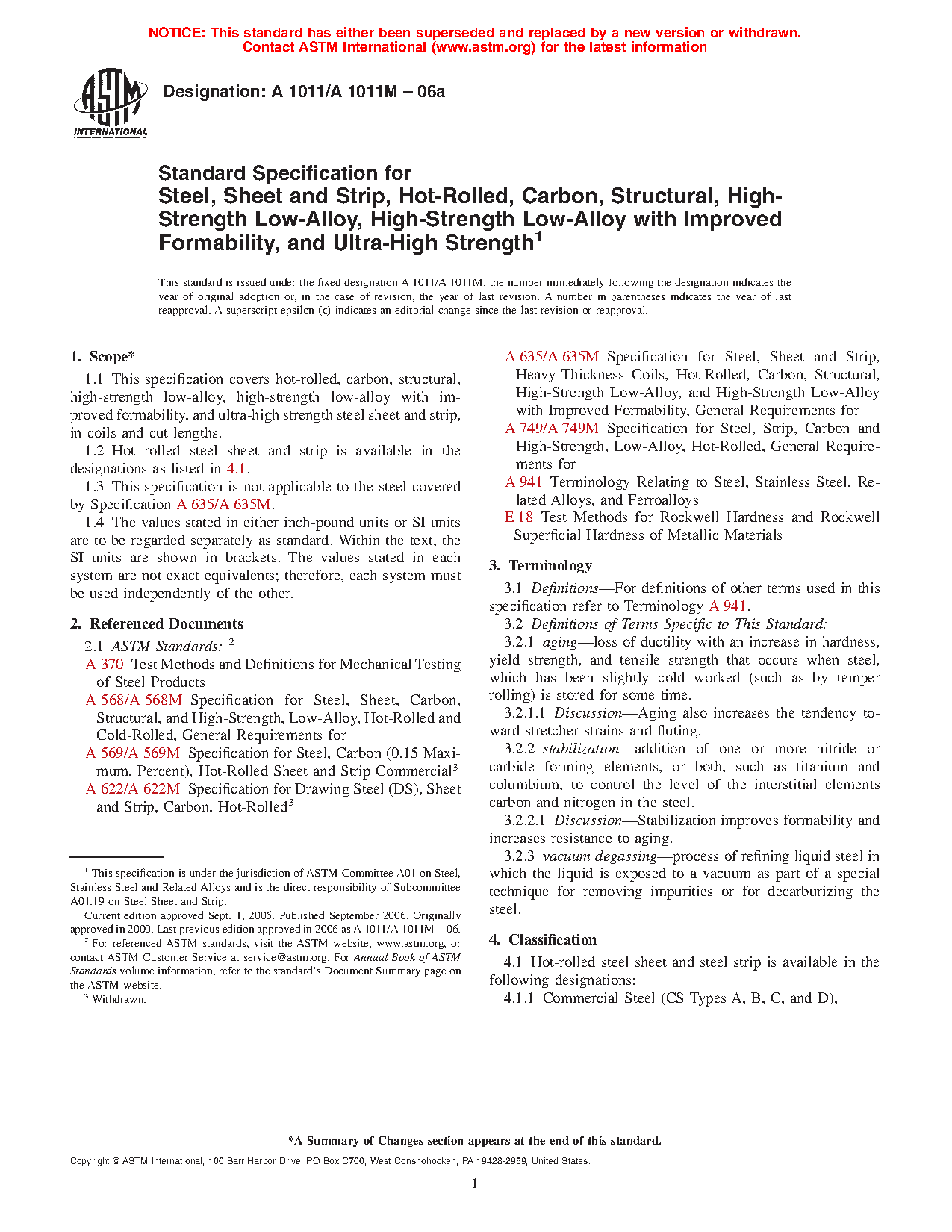 1.1 This specification covers hot-rolled, carbon, structural, high-strength low-alloy, high-strength low-alloy with improved formability, and ultra-high strength steel sheet and strip, in coils and cut lengths.