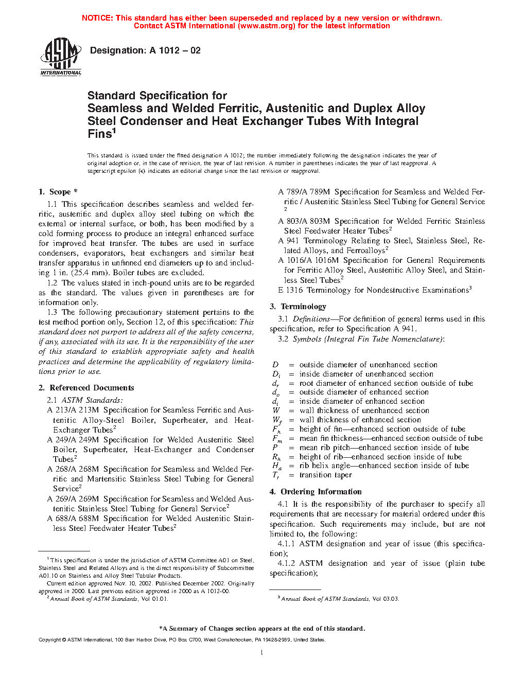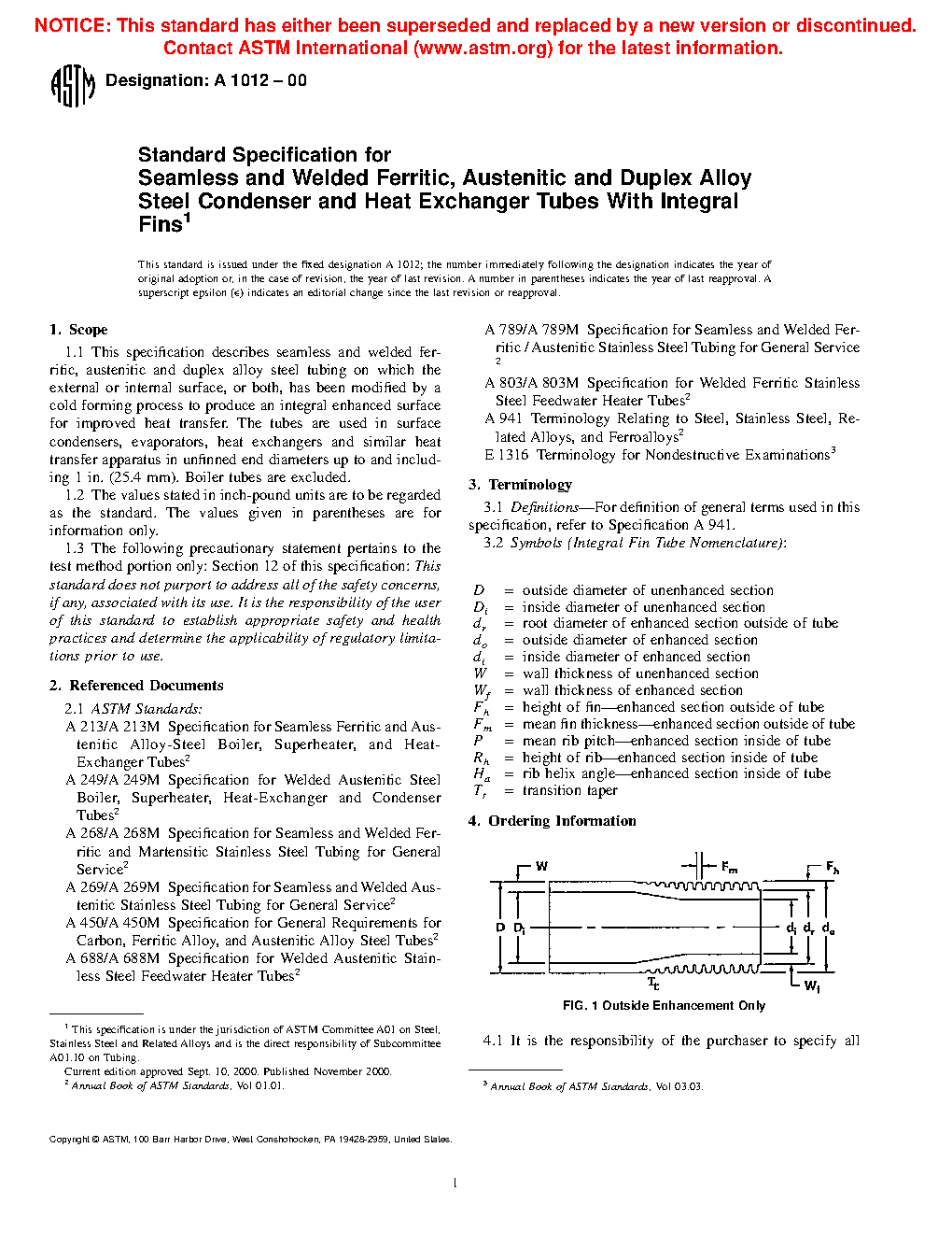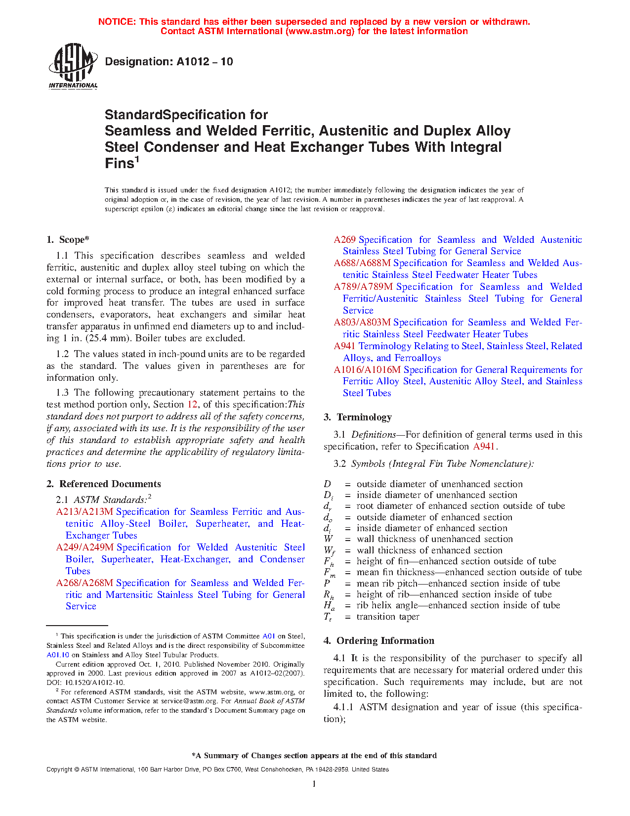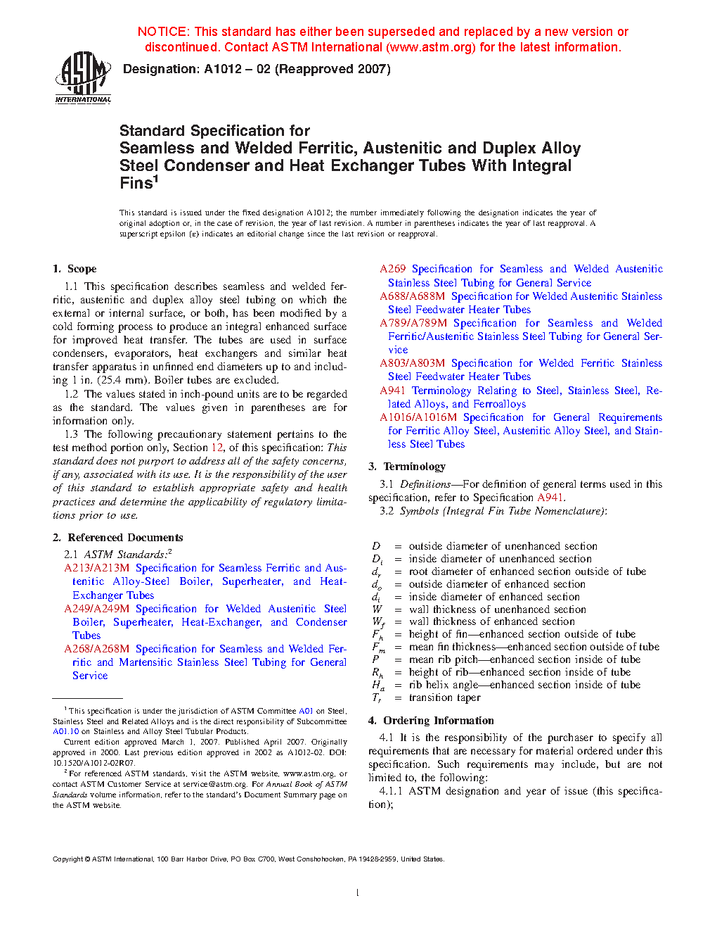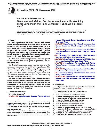 This specification describes seamless and welded ferritic, austenitic and duplex alloy steel tubing on which the external or internal surface, or both, has been modified by a cold forming process to produce and integral enhanced surface for improved heat transfer. The integrally enhanced (finned) tubes shall be manufactured from seamless, welded, or welded/cold worked plain tubes that conform to the specified requirements. The tube shall conform to the requirements for tensile properties prescribed in the governing plain tube specification. Pneumatic tests, eddy-current tests, air underwater pressure tests, pressure differential tests, and hydrostatic tests shall be made in accordance with the requirements specified.