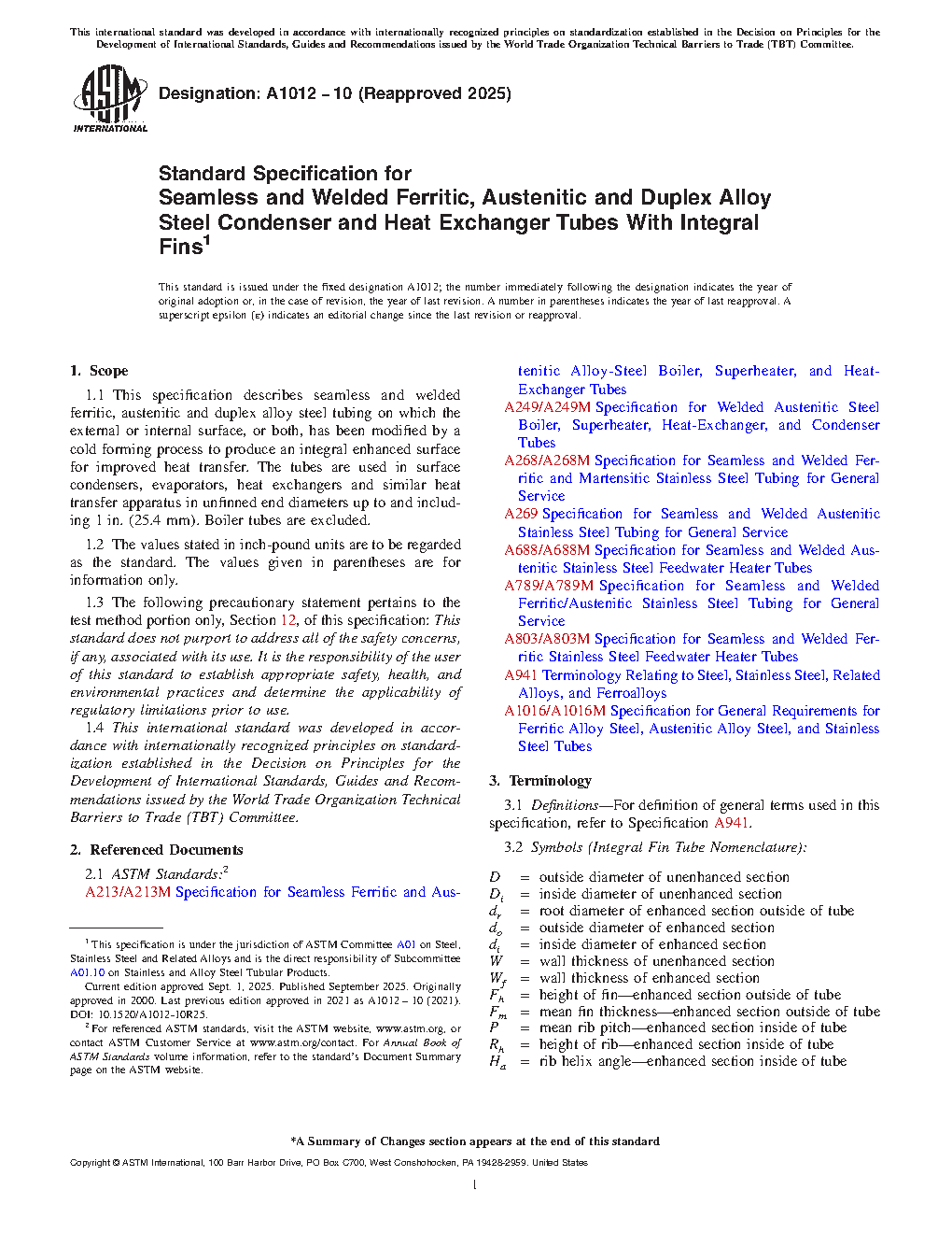 1.1 This specification describes seamless and welded ferritic, austenitic and duplex alloy steel tubing on which the external or internal surface, or both, has been modified by a cold forming process to produce an integral enhanced surface for improved heat transfer. The tubes are used in surface condensers, evaporators, heat exchangers and similar heat transfer apparatus in unfinned end diameters up to and including 1 in. (25.4 mm). Boiler tubes are excluded.