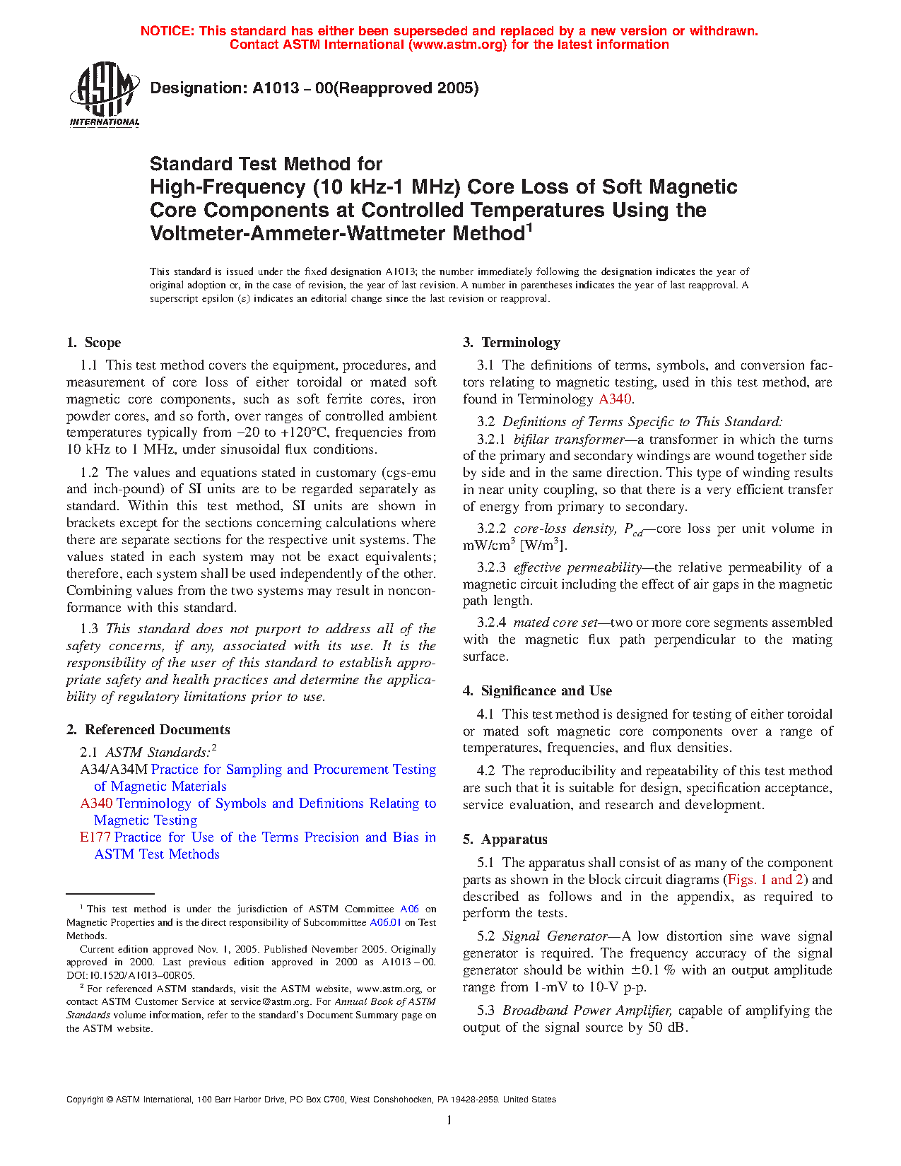 1.1 This test method covers the equipment, procedures, and measurement of core loss of either toroidal or mated soft magnetic core components, such as soft ferrite cores, iron powder cores, and so forth, over ranges of controlled ambient temperatures typically from −20 to +120°C, frequencies from 10 kHz to 1 MHz, under sinusoidal flux conditions.